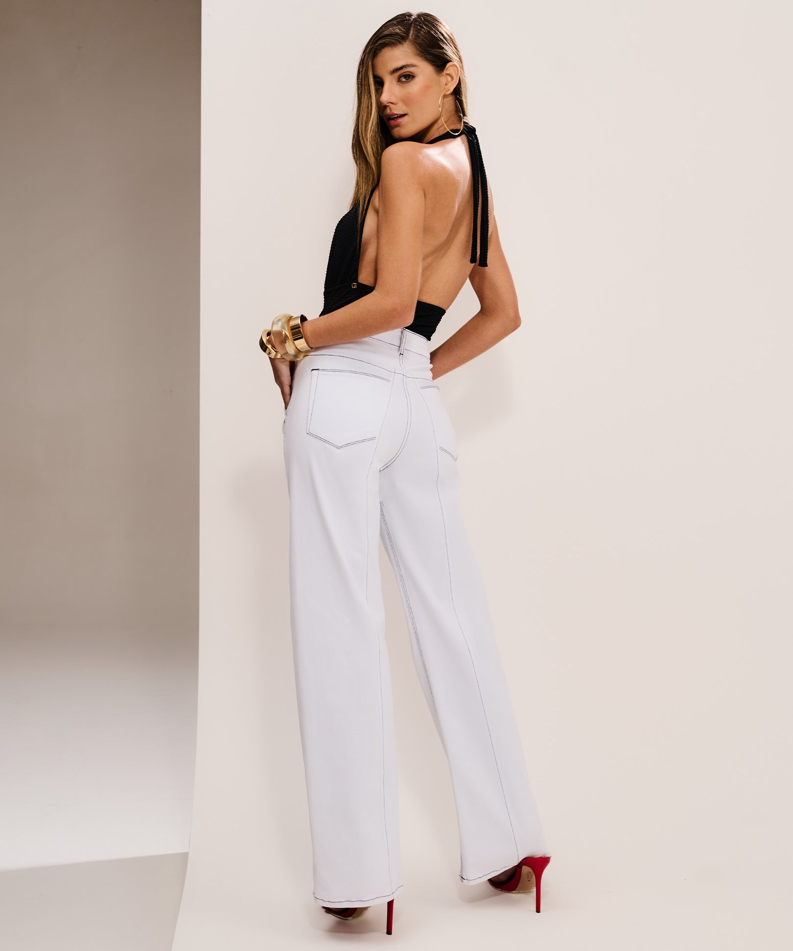 Calça Sarja Wide Leg Branca com Pesponto Preto