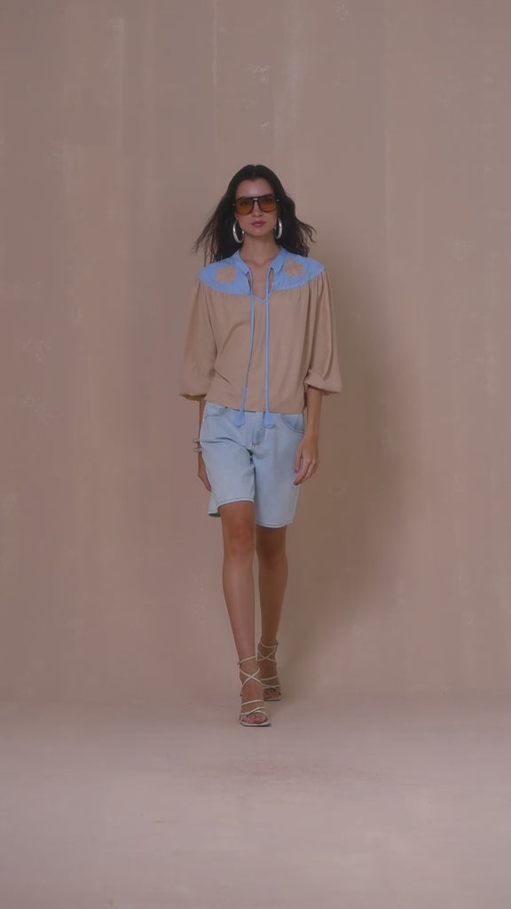 A peça ideal para injetar charme e versatilidade no seu visual. Esta bata bicolor possui um comprimento ideal, curto mas não cropped, que facilita diversas combinações. O design é realçado pelos bordados detalhados nos ombros na parte da frente, adicionando um toque artesanal e sofisticado.