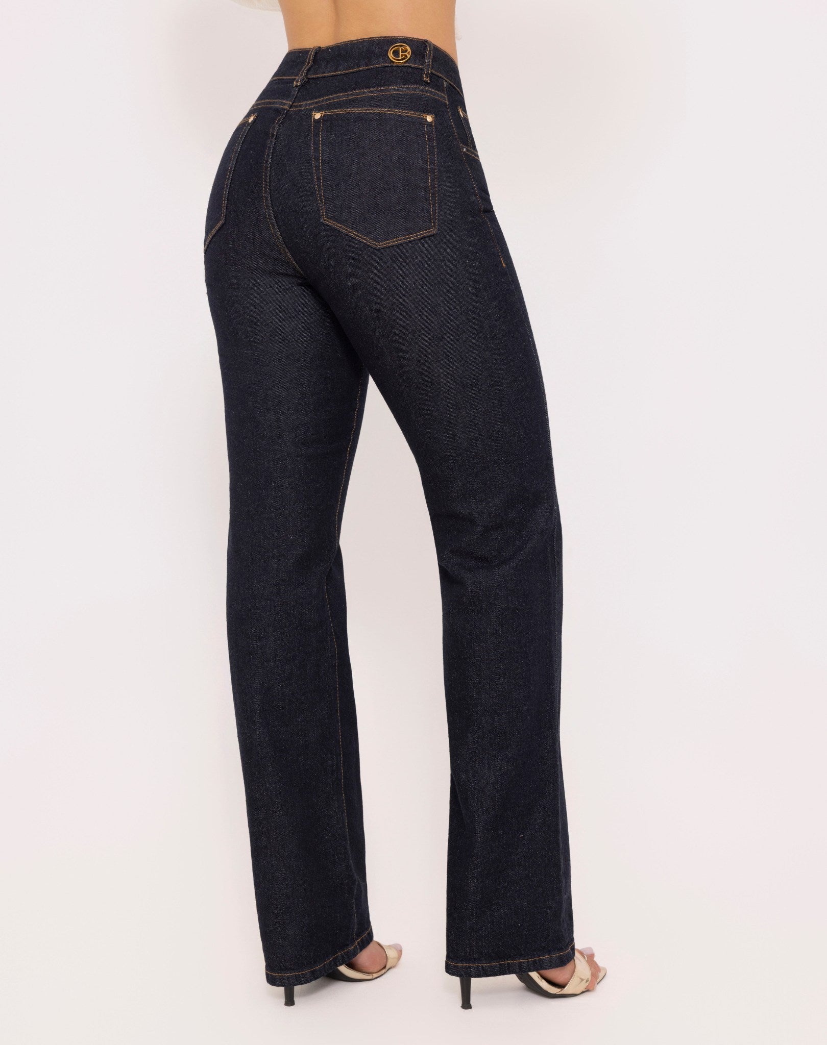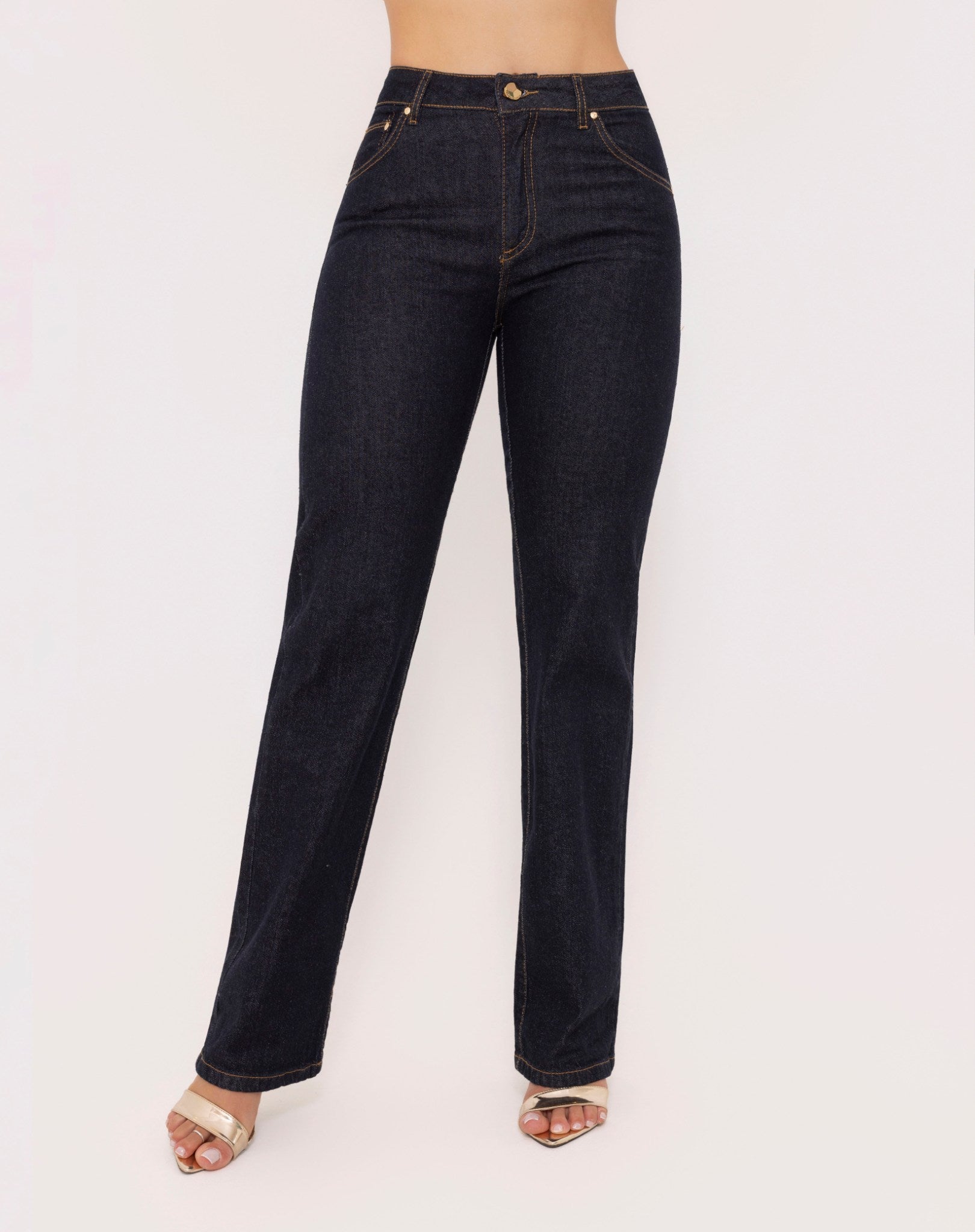 A peça que define o estilo atemporal e a versatilidade no seu guarda-roupa. Esta calça reta é confeccionada em jeans índigo escuro, uma lavanderia clássica e sofisticada. O pesponto caramelo cria um contraste elegante que valoriza o design.