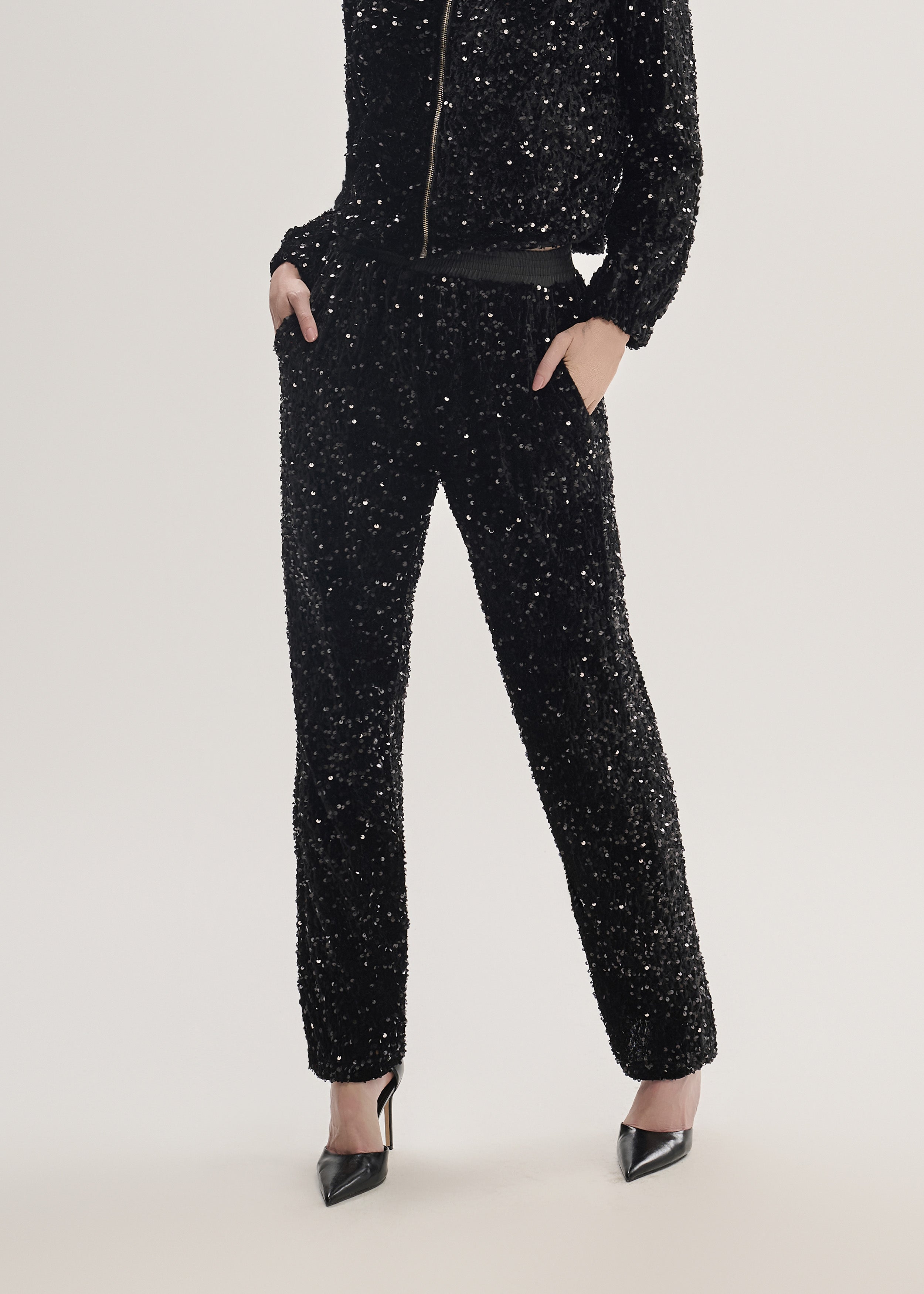 Para quem gosta de ousar com elegância, a calça jegging em tecido de paetês preto é a escolha ideal. Com caimento justo e cós de elástico que garante conforto, ela une brilho e modernidade em uma peça que valoriza o corpo e transforma qualquer look. Possui bolsos frontais e estrutura que acompanha os movimentos com leveza.