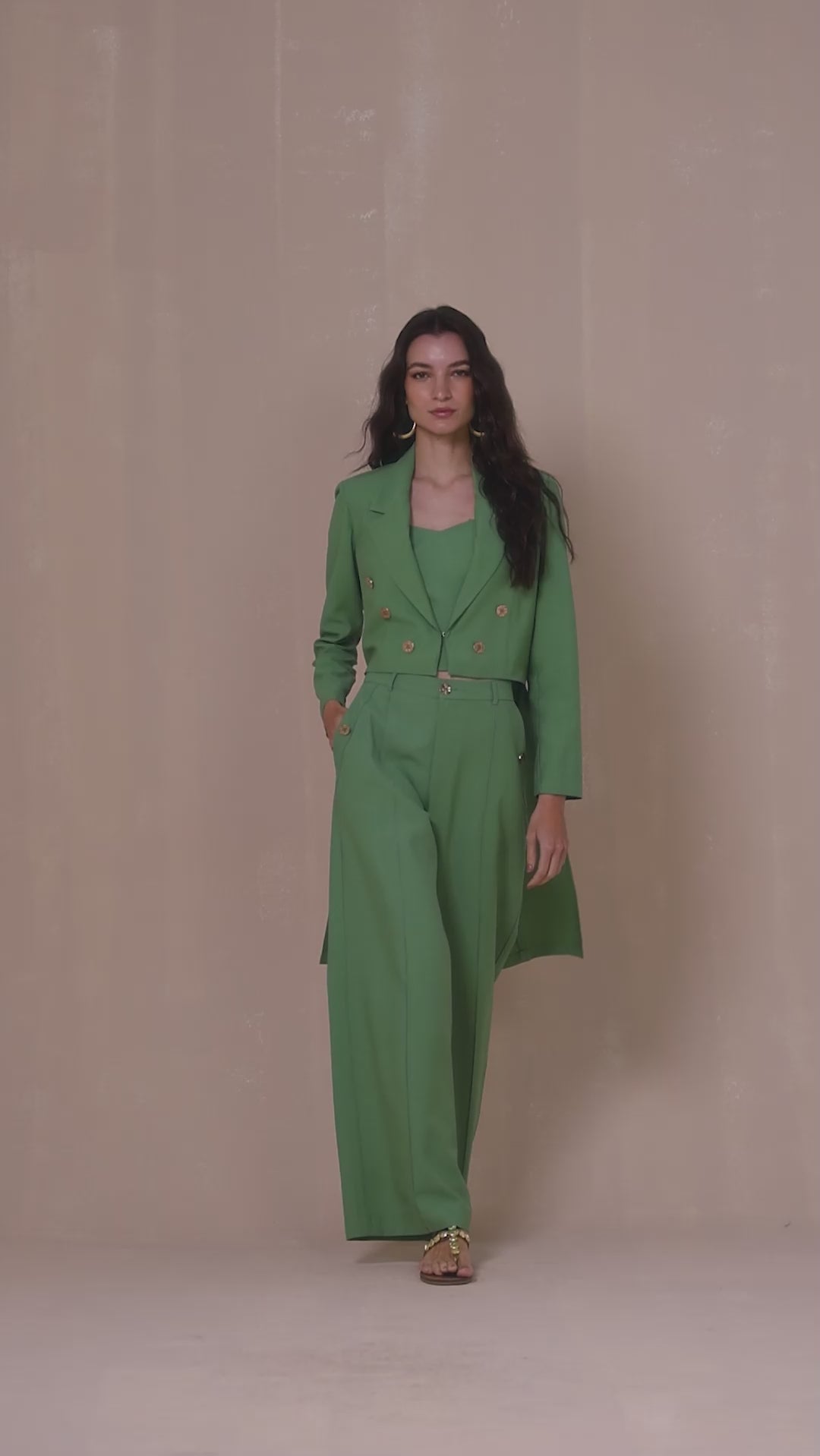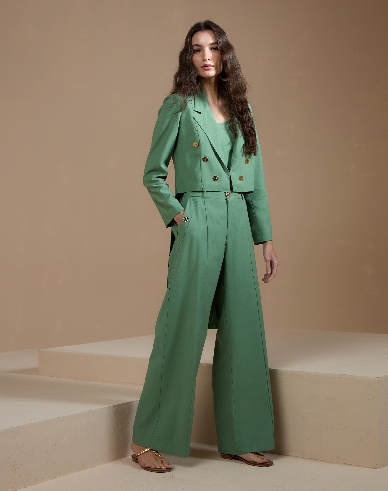 Os botões dourados na frente criam um ponto de contraste elegante com a cor alecrim, tornando a peça ideal para looks mais elaborados.