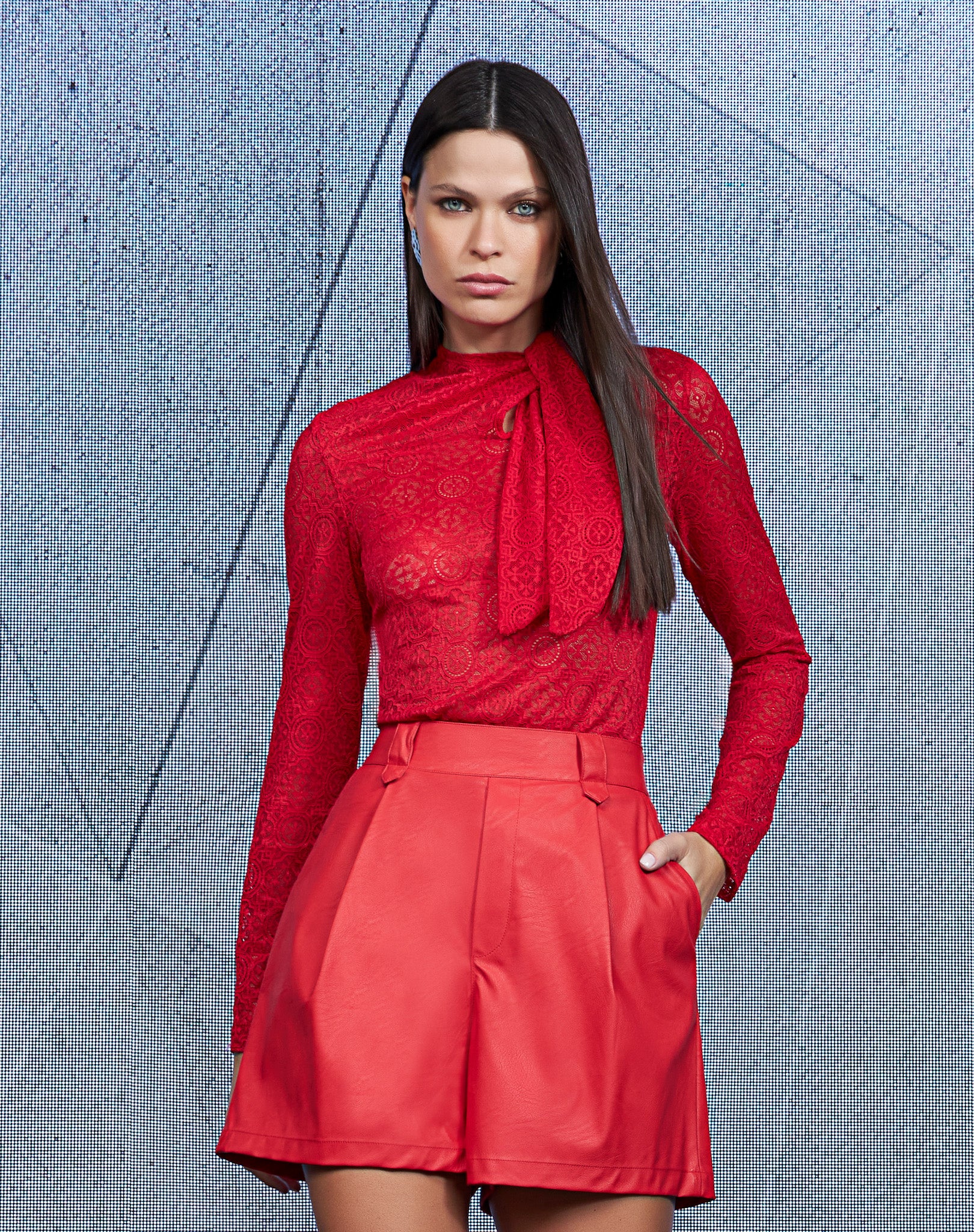 Para quem busca uma peça prática com um toque de romantismo, essa blusa em renda delicada entrega charme e sofisticação em doses equilibradas. Com gola alta fechada que se transforma em um laço feminino e mangas longas, o modelo valoriza o corpo com leve transparência e caimento fluido.