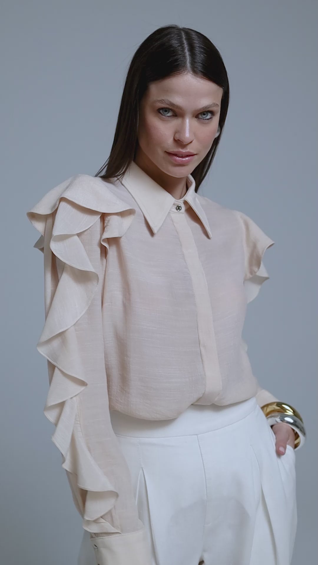 Esta camisa feminina é um destaque na coleção por sua modelagem refinada e detalhes marcantes. Com mangas longas inteiramente adornadas por babados — do ombro ao punho — ela mistura feminilidade com um toque de ousadia na medida certa. Confeccionada em tecido leve e confortável, é uma peça que transita entre o ambiente profissional e eventos sociais, dependendo das combinações. Use com calças de alfaiataria, saias midi ou até mesmo com jeans para um contraste moderno. Finalize com saltos, sapatilhas ou botas, conforme o momento.