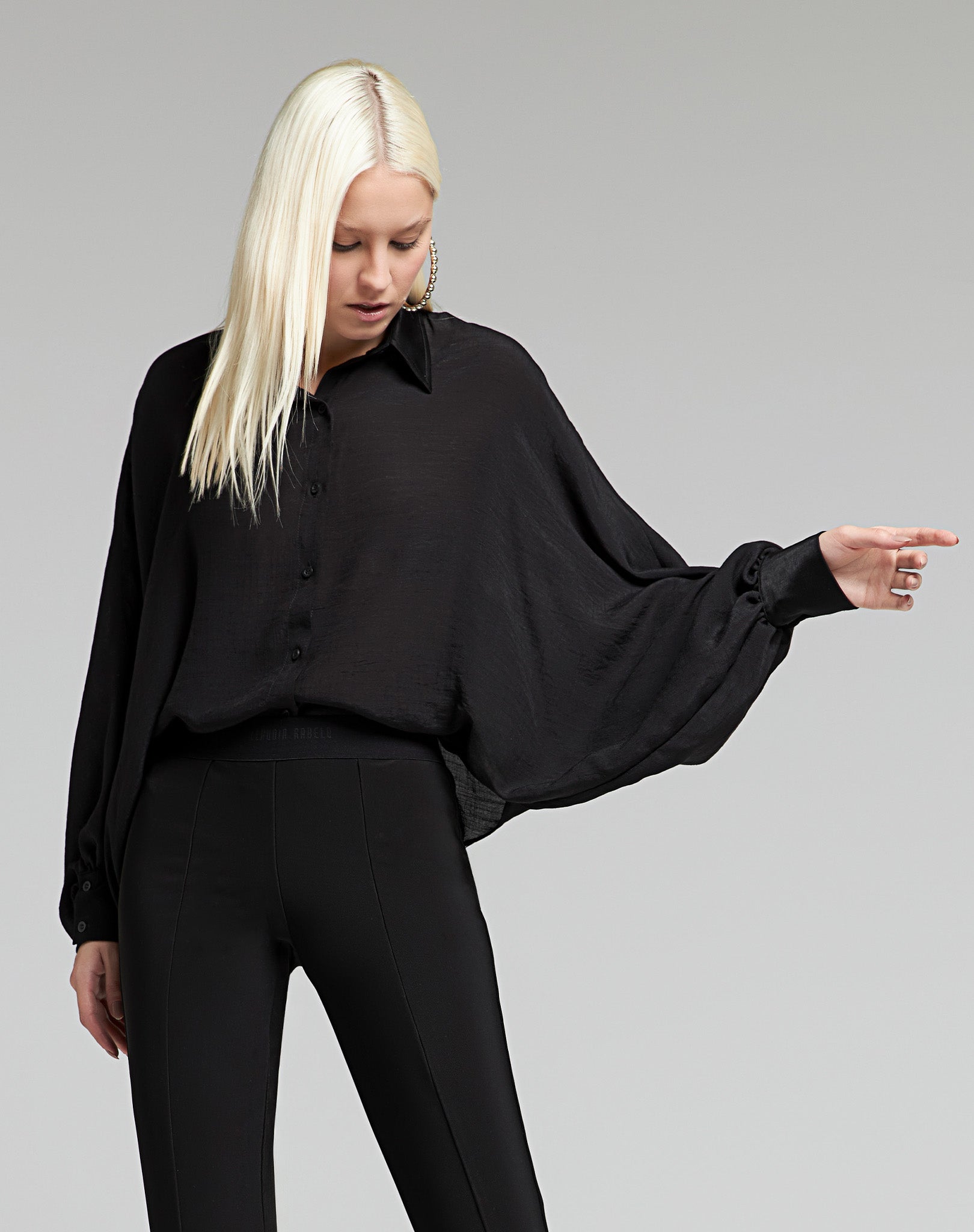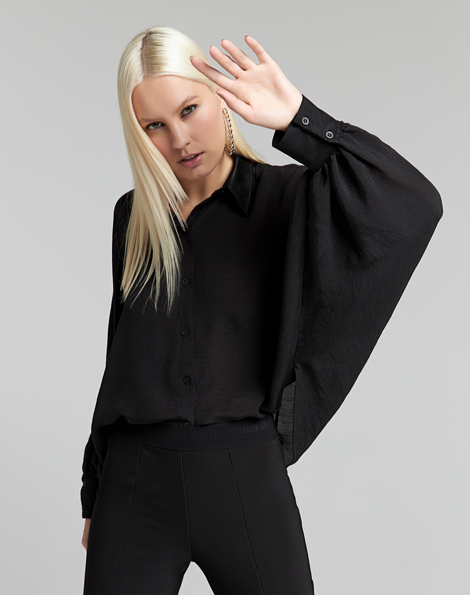 Com modelagem contemporânea e toque sofisticado, essa camisa se destaca pelas mangas amplas que criam volume e movimento, finalizadas por punhos ajustados com botões. O comprimento mais curto oferece equilíbrio ao visual, funcionando bem tanto por dentro quanto por fora de peças de cintura alta.