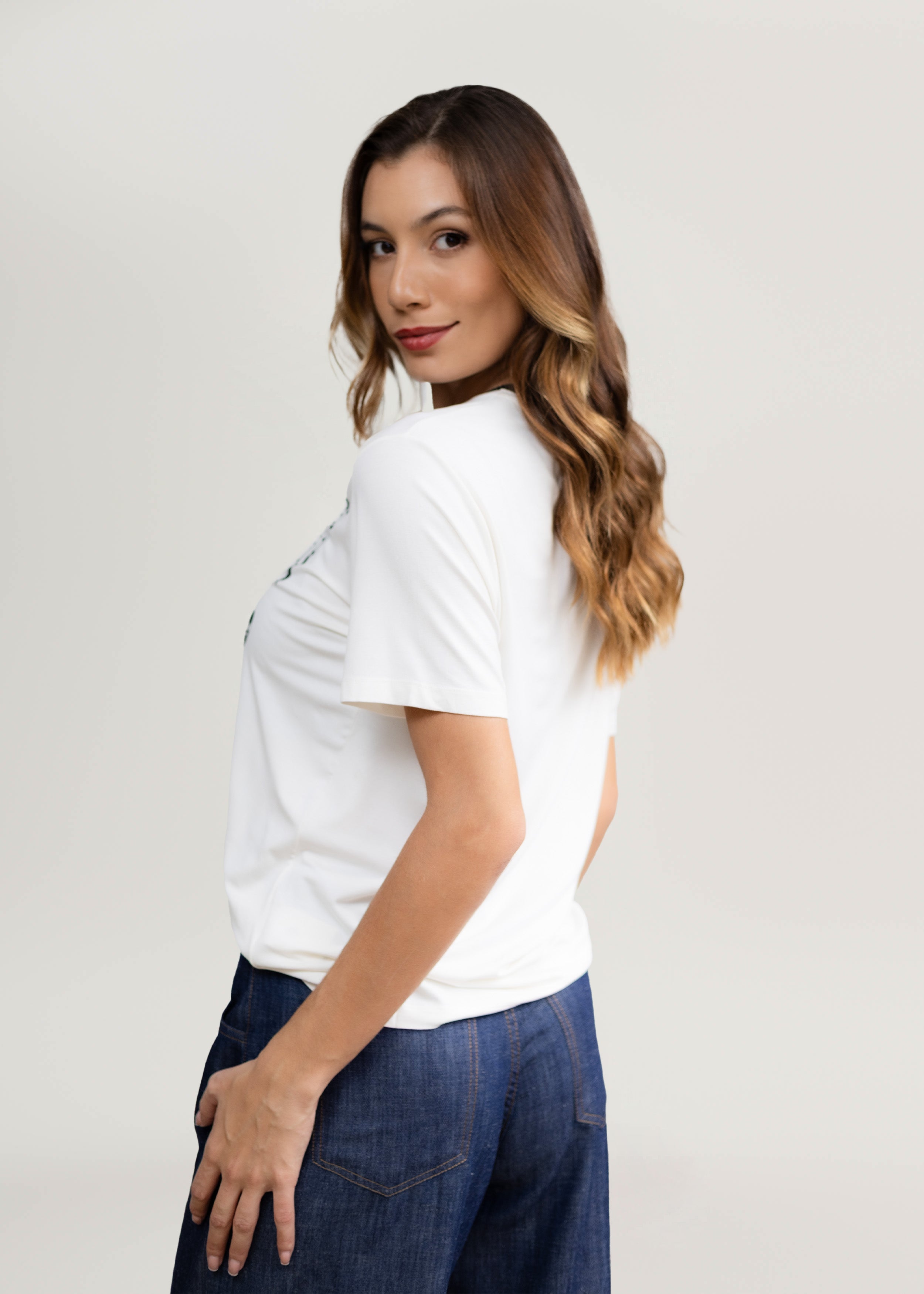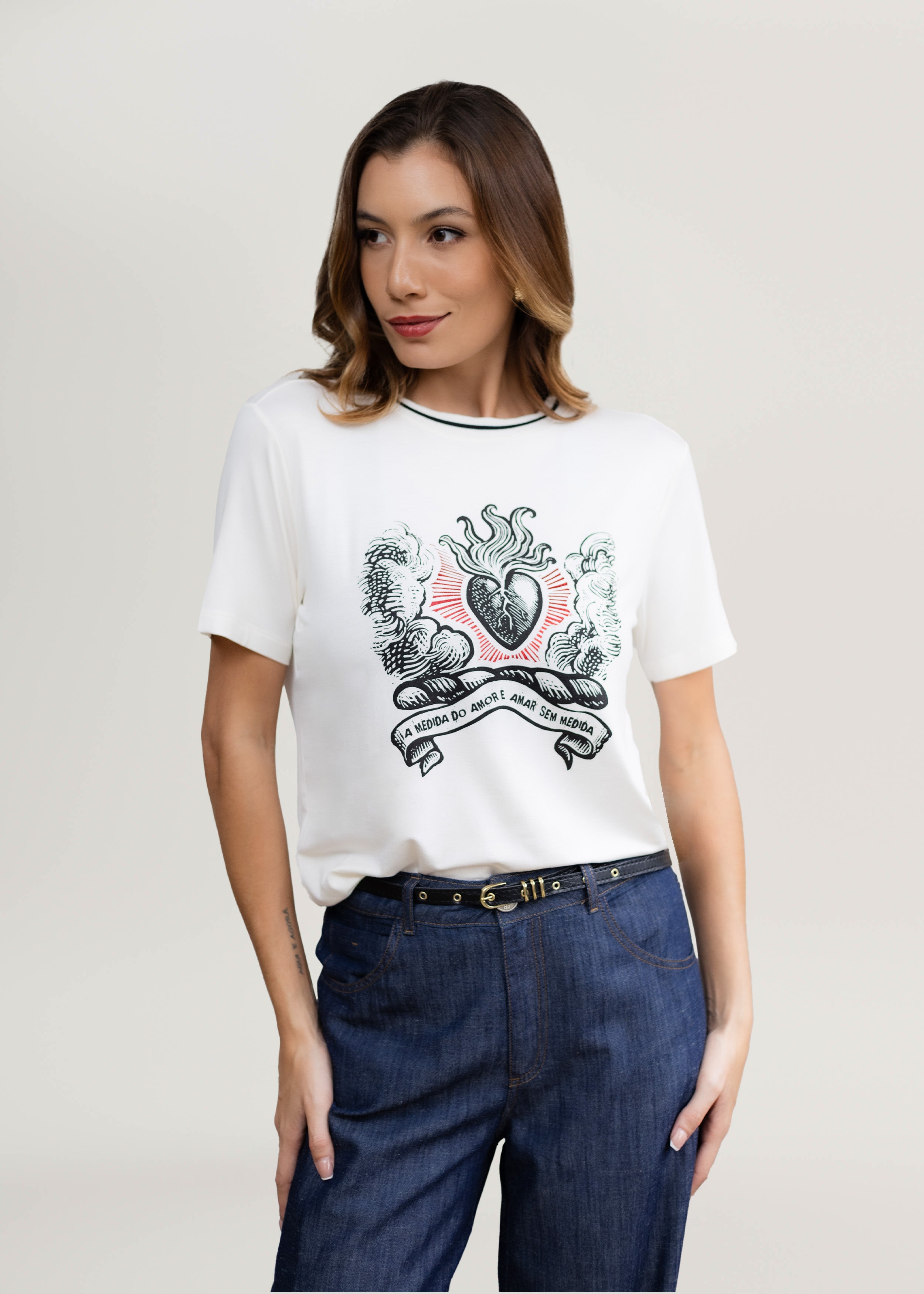 T-shirt com estampa localizada exclusiva coleção outono inverno 2025 Claudia Rabelo.