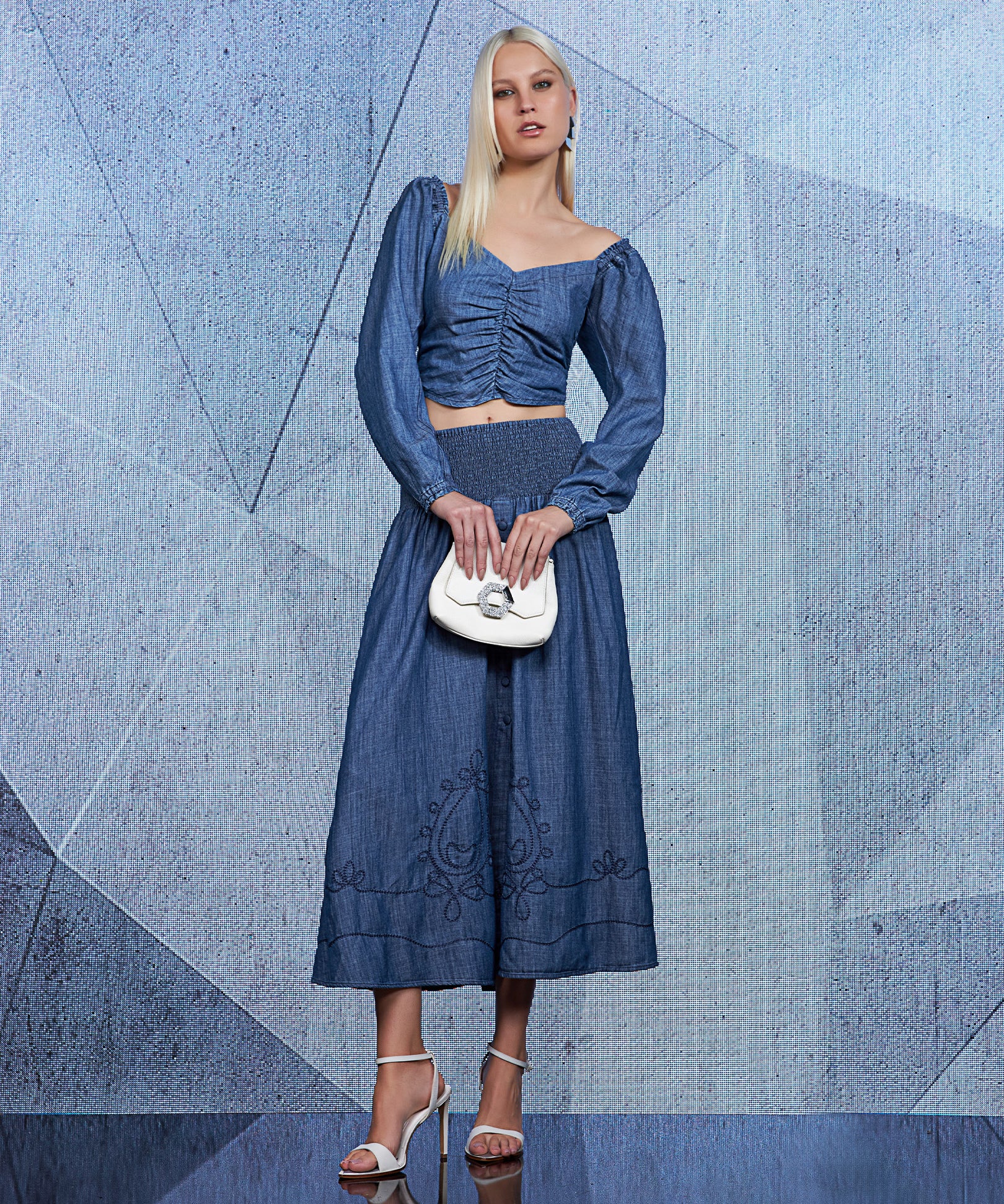 Saia Midi Listrada Náutica em Algodão com Cintura Alta