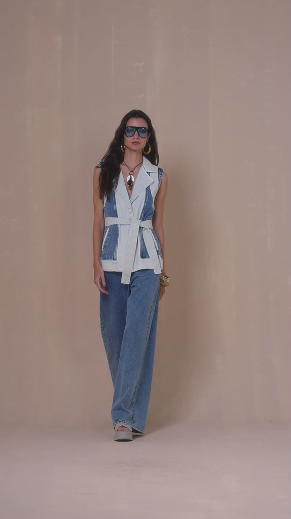 A terceira peça que garante um visual moderno e diferenciado. Este colete jeans maxi possui um comprimento alongado, que confere um caimento elegante e impactante. O grande destaque é o design bicolor, com a combinação de dois tons de lavagem em azul e branco, adicionando textura e profundidade.
