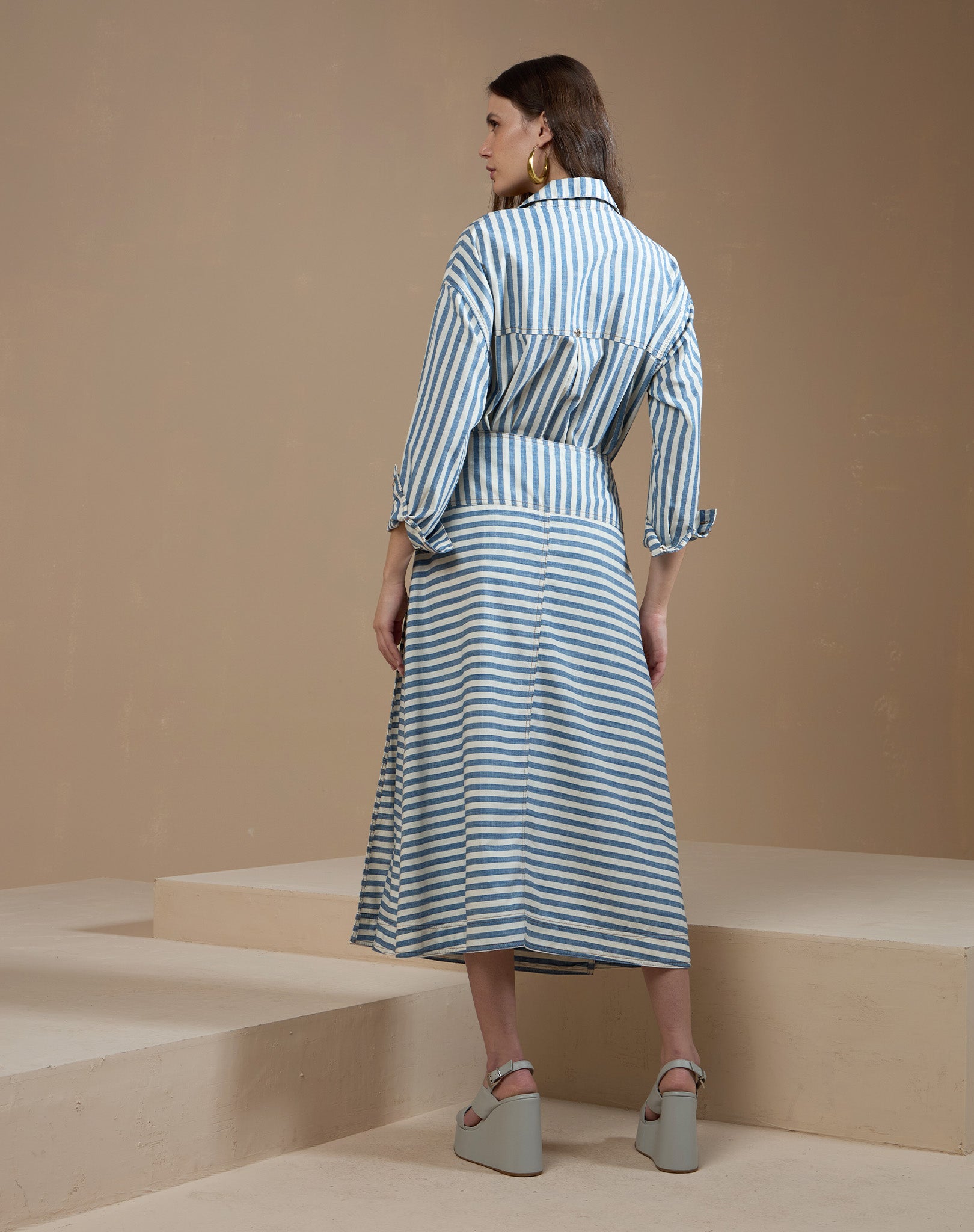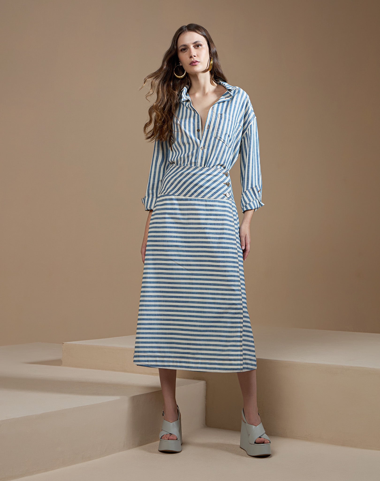 Saia Midi Listrada Náutica em Algodão com Cintura Alta