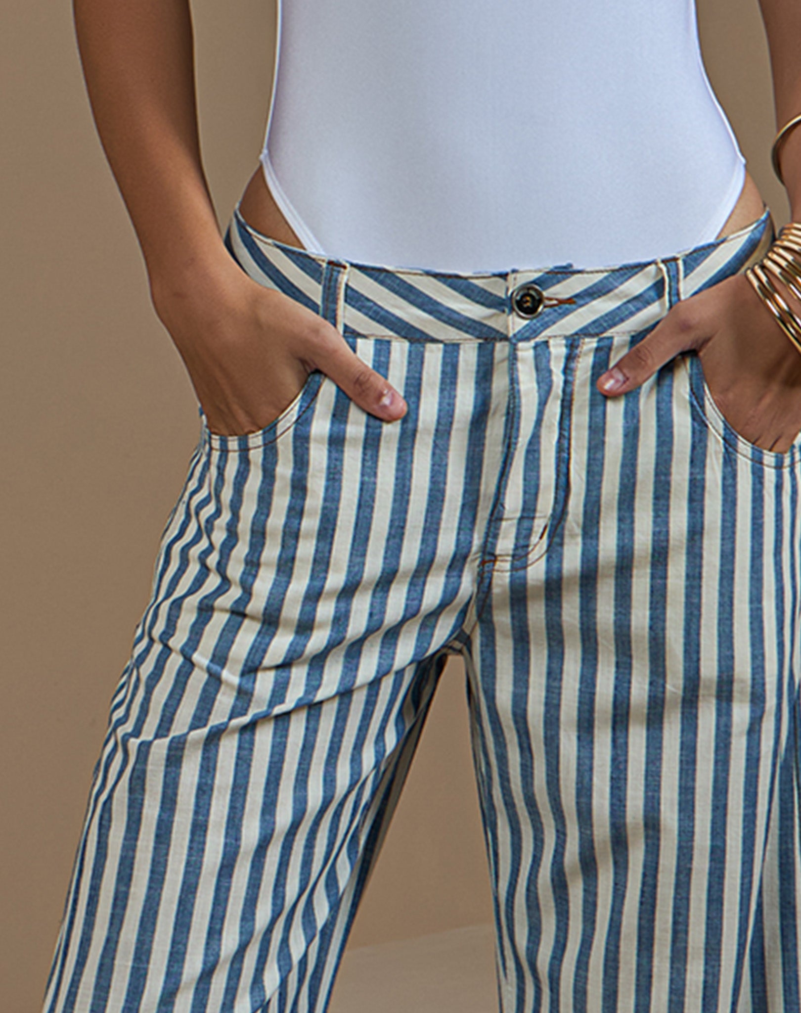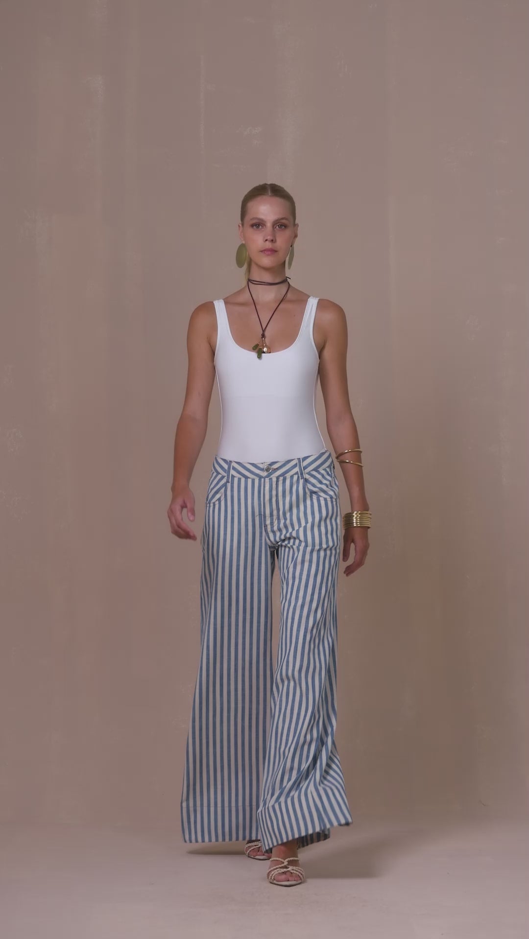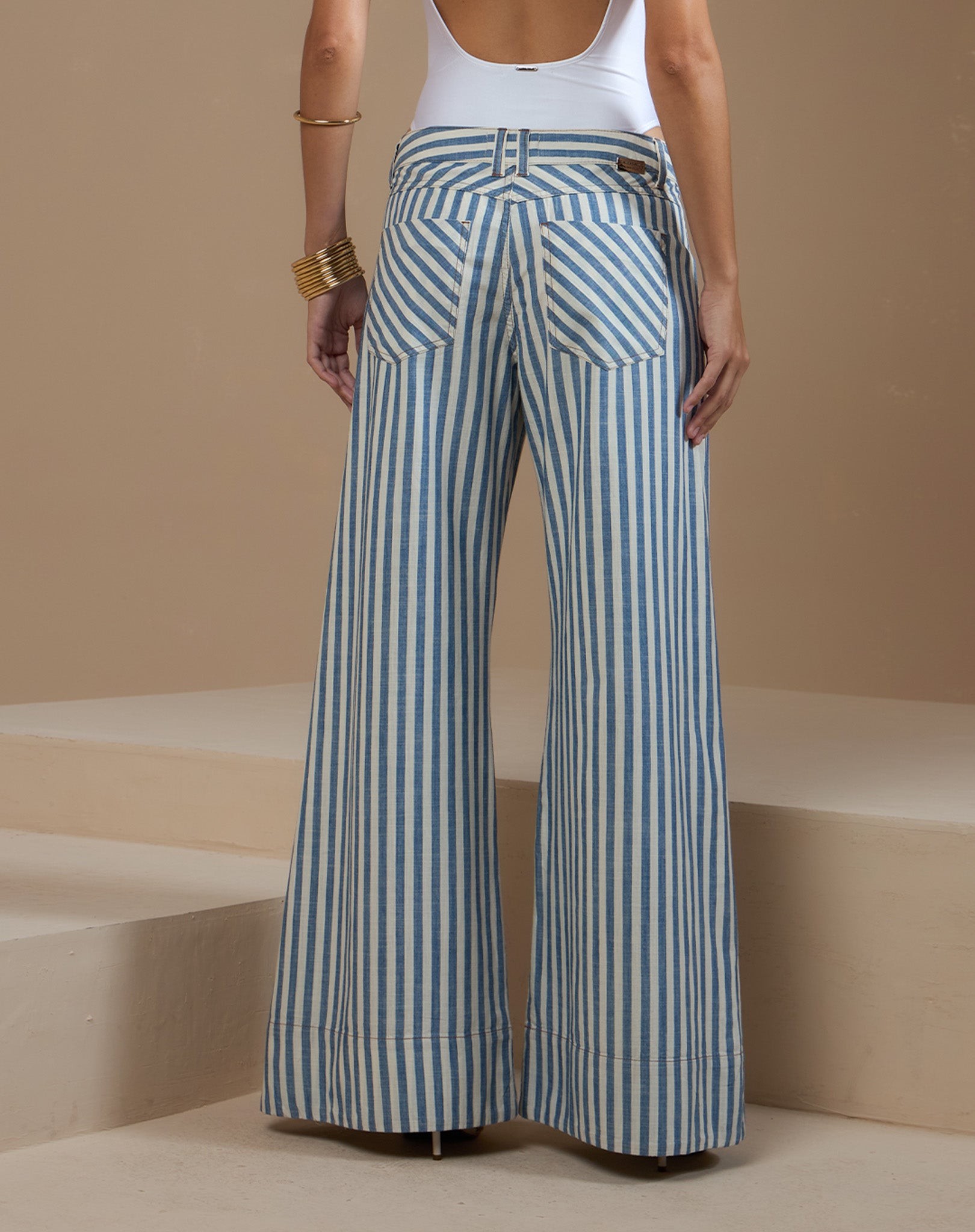 A sofisticação encontra o frescor do estilo náutico nesta calça pantalona 100% algodão. Seu padrão listrado confere um ar leve e atemporal, enquanto o detalhe da costura em tom chocolate cria um contraste elegante e moderno. Com bolsos na frente e atrás, une funcionalidade e design, garantindo praticidade no dia a dia.