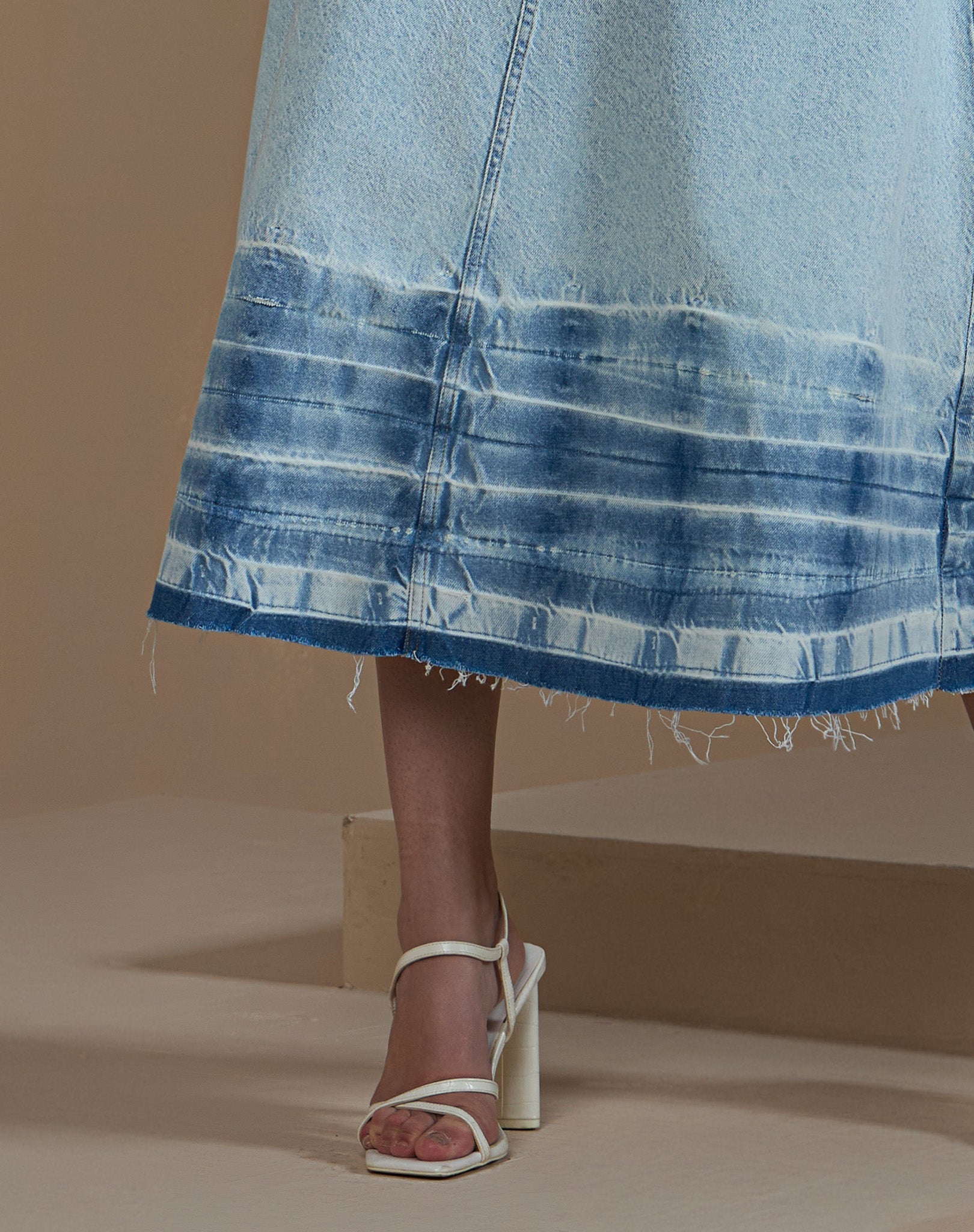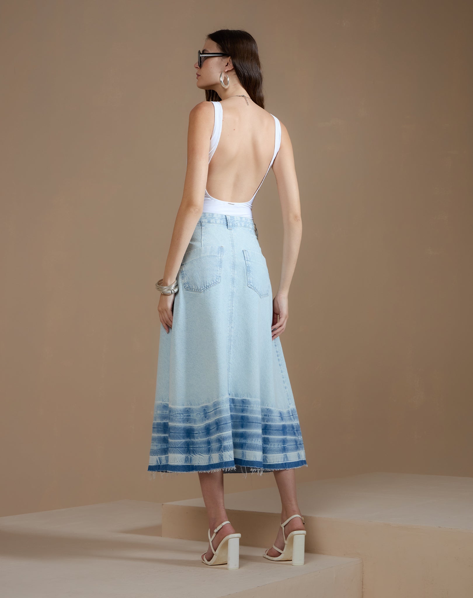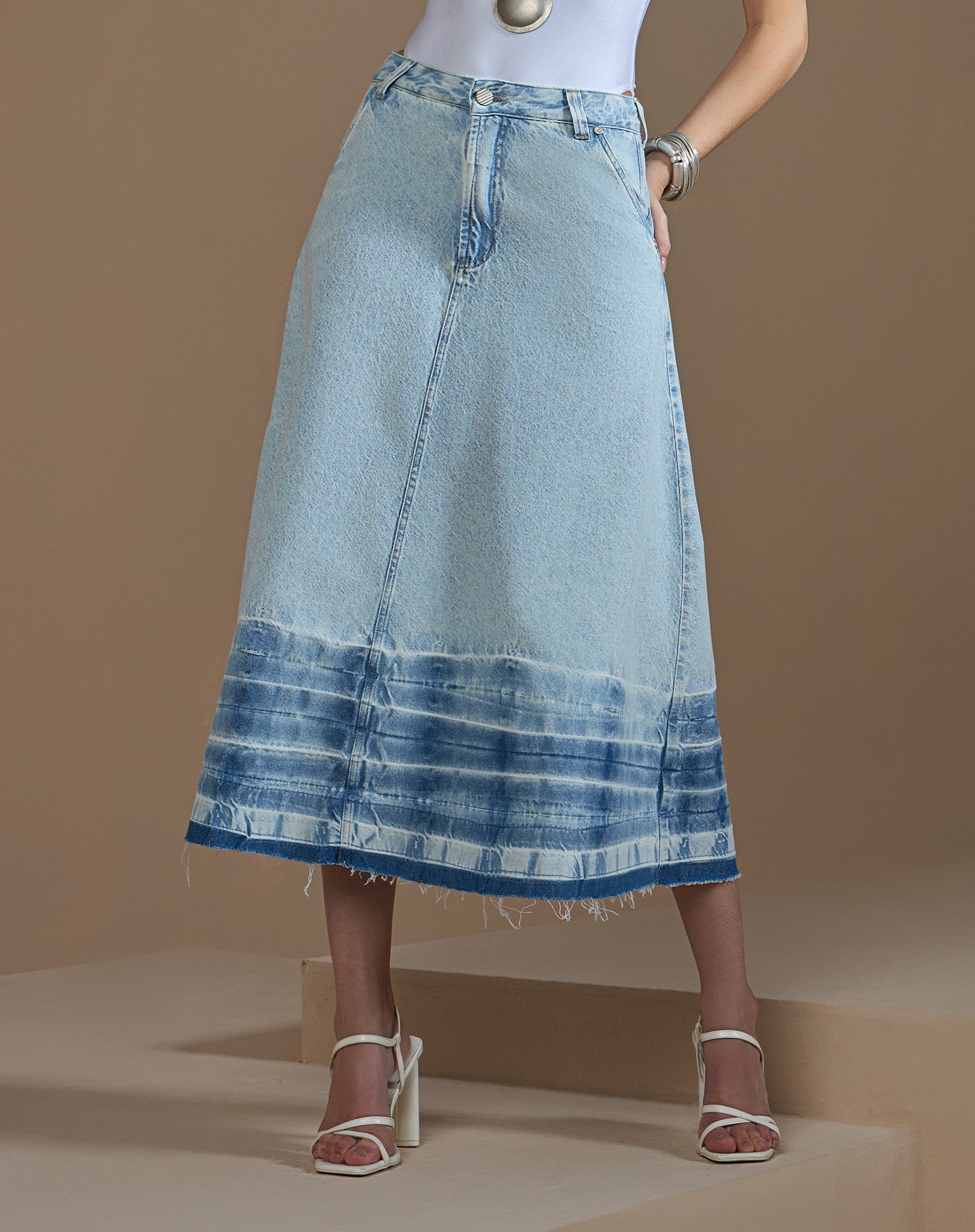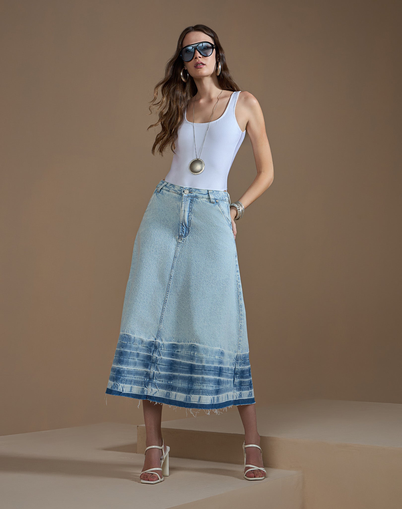 A peça que une a atemporalidade do jeans com a tendência do tie dye. Esta saia jeans longa possui um caimento elegante e alongado, ideal para um visual moderno e sofisticado. A lavanderia clara (clear) confere leveza, perfeita para o dia a dia.