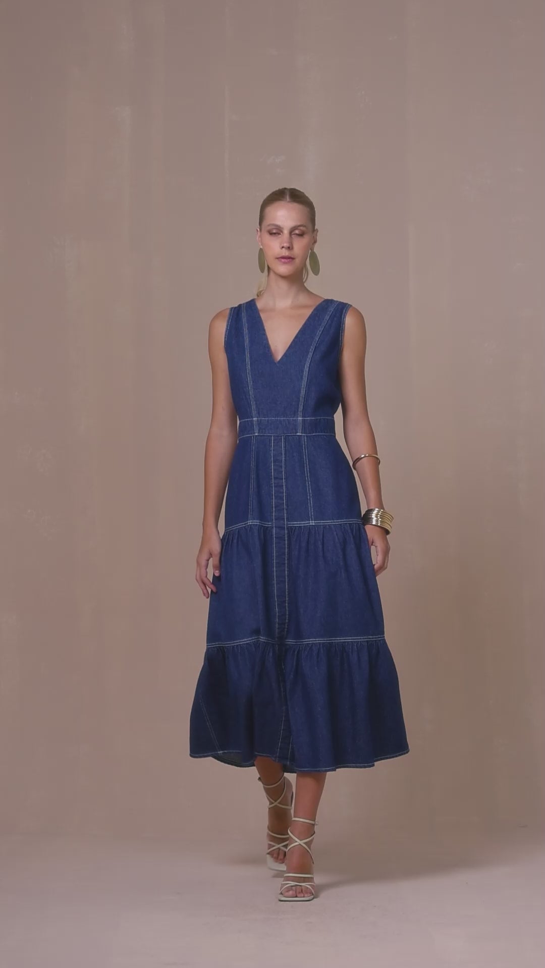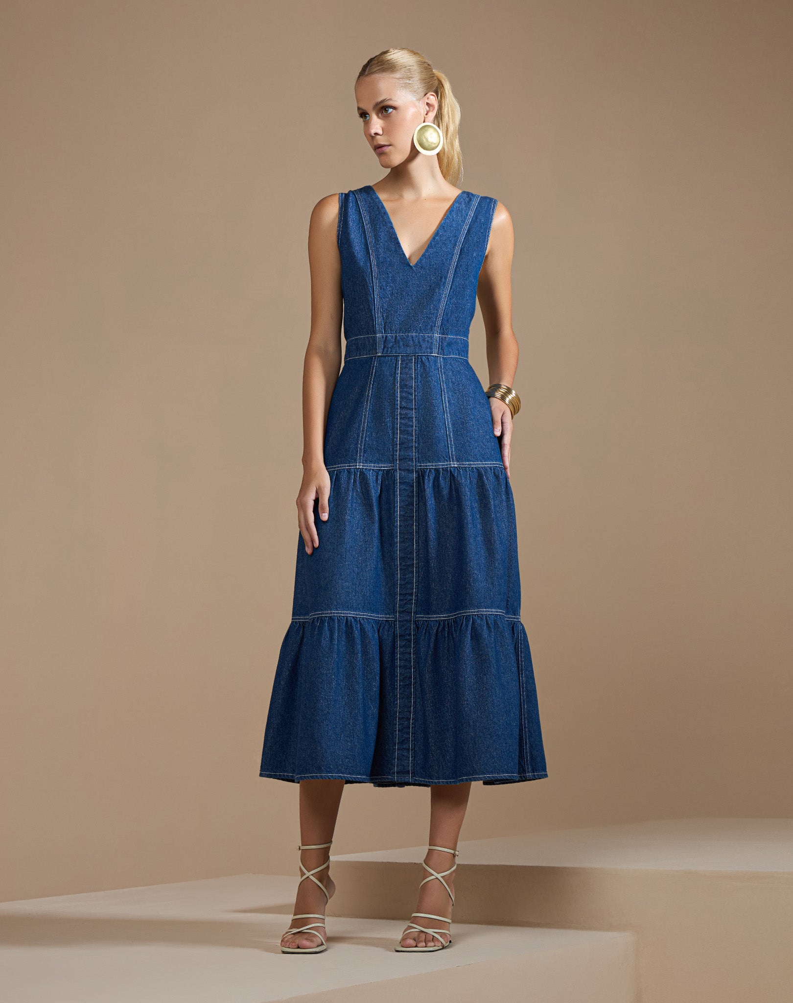 Uma peça que combina o charme do jeans com a delicadeza das camadas. Este vestido midi jeans apresenta um design sem mangas e decote V que valoriza o colo, com o top mais próximo ao corpo e a saia que ganha volume a partir da cintura.