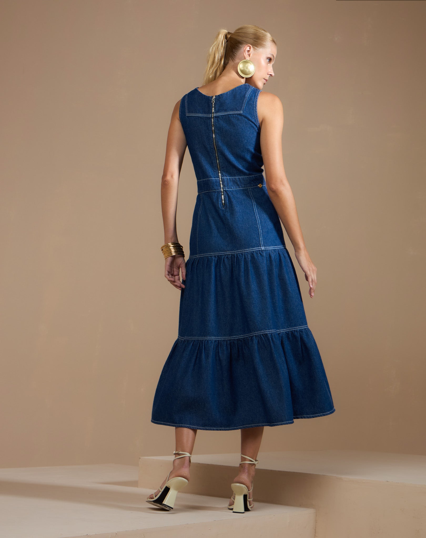 Vestido Jeans Midicom Saia em Camadas e Pesponto Contrastante