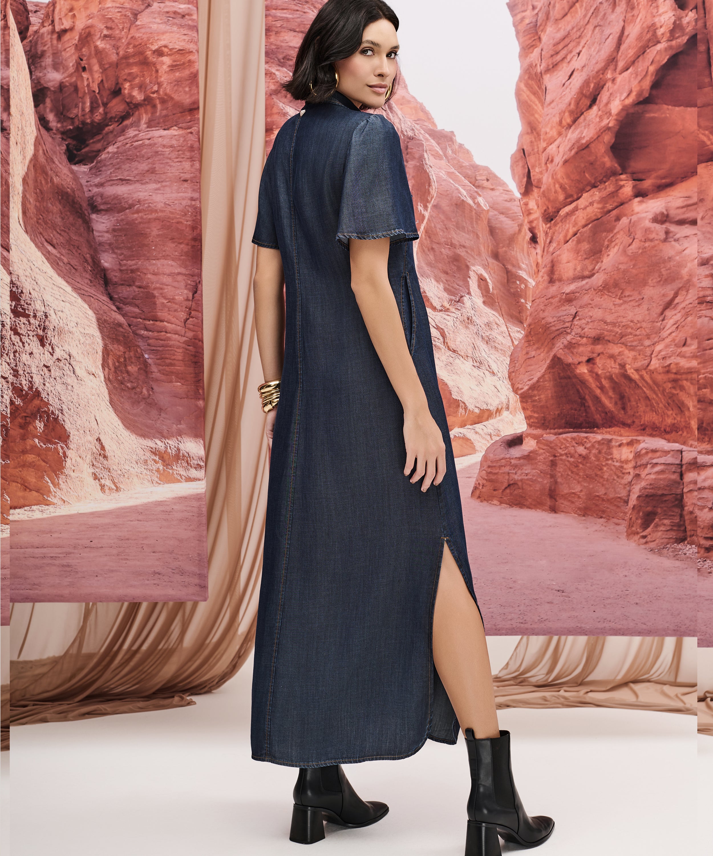 Vestido Jeans Midicom Saia em Camadas e Pesponto Contrastante