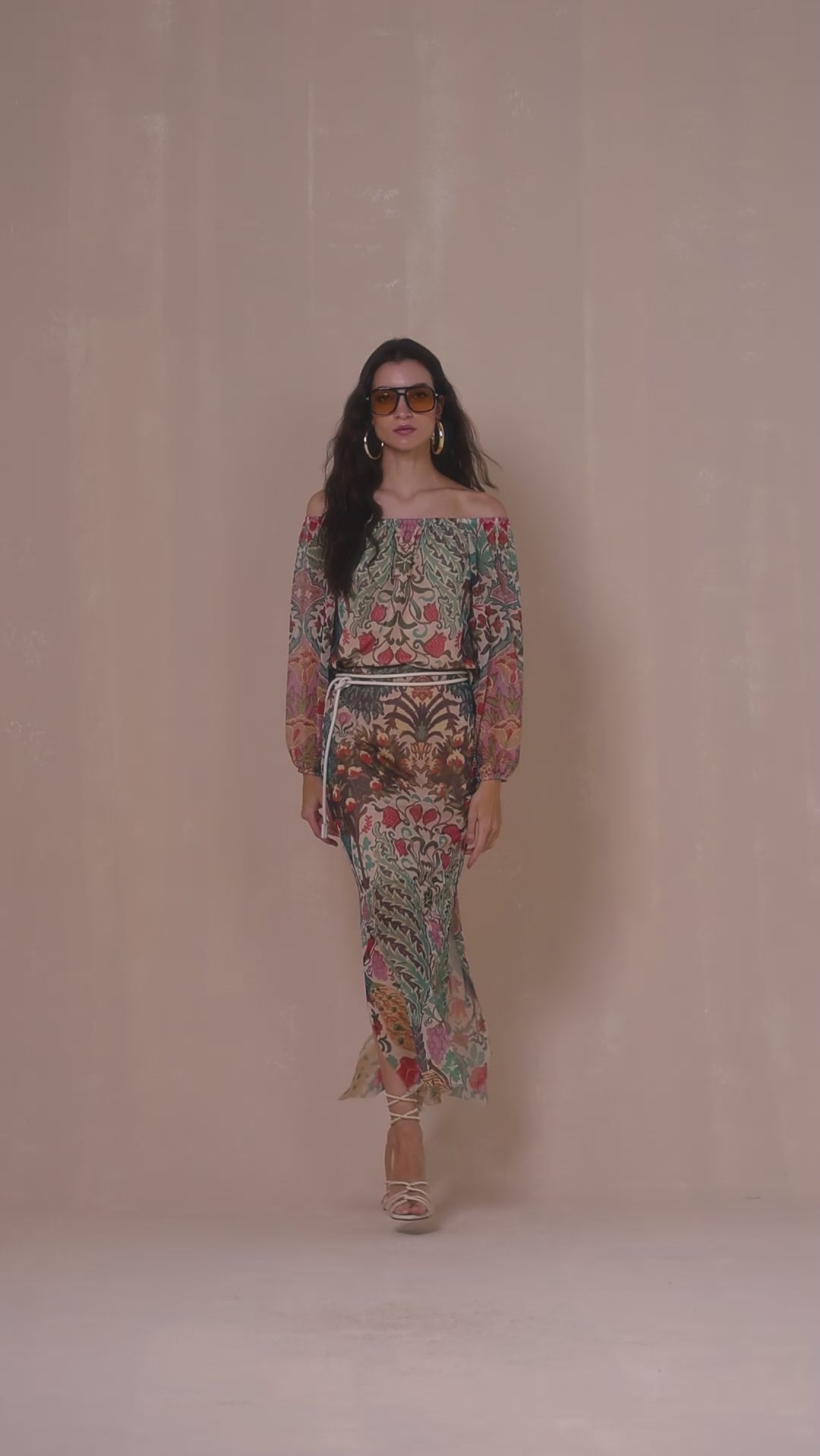 A saia midi em tule da coleção Primavera-Verão 26 traz um visual impactante e sofisticado. Com estampa Pavão exclusiva, inspirada em mandalas e composta por elementos florais em uma paleta de cores vibrantes, a peça combina leveza e fluidez para um caimento elegante.