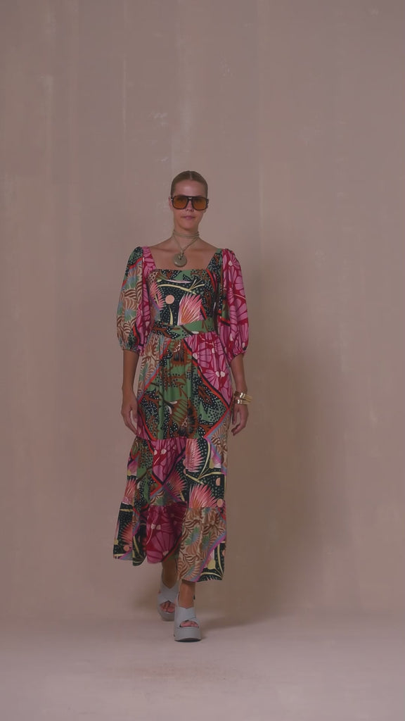 As mangas 3/4 bufantes com elástico na barra adicionam um toque romântico e volumoso. A saia em camadas confere ainda mais fluidez e charme à peça. O grande destaque é a estampa exclusiva Lenço, que traz uma explosão de cores vibrantes e motivos que misturam harmoniosamente formas geométricas e orgânicas.