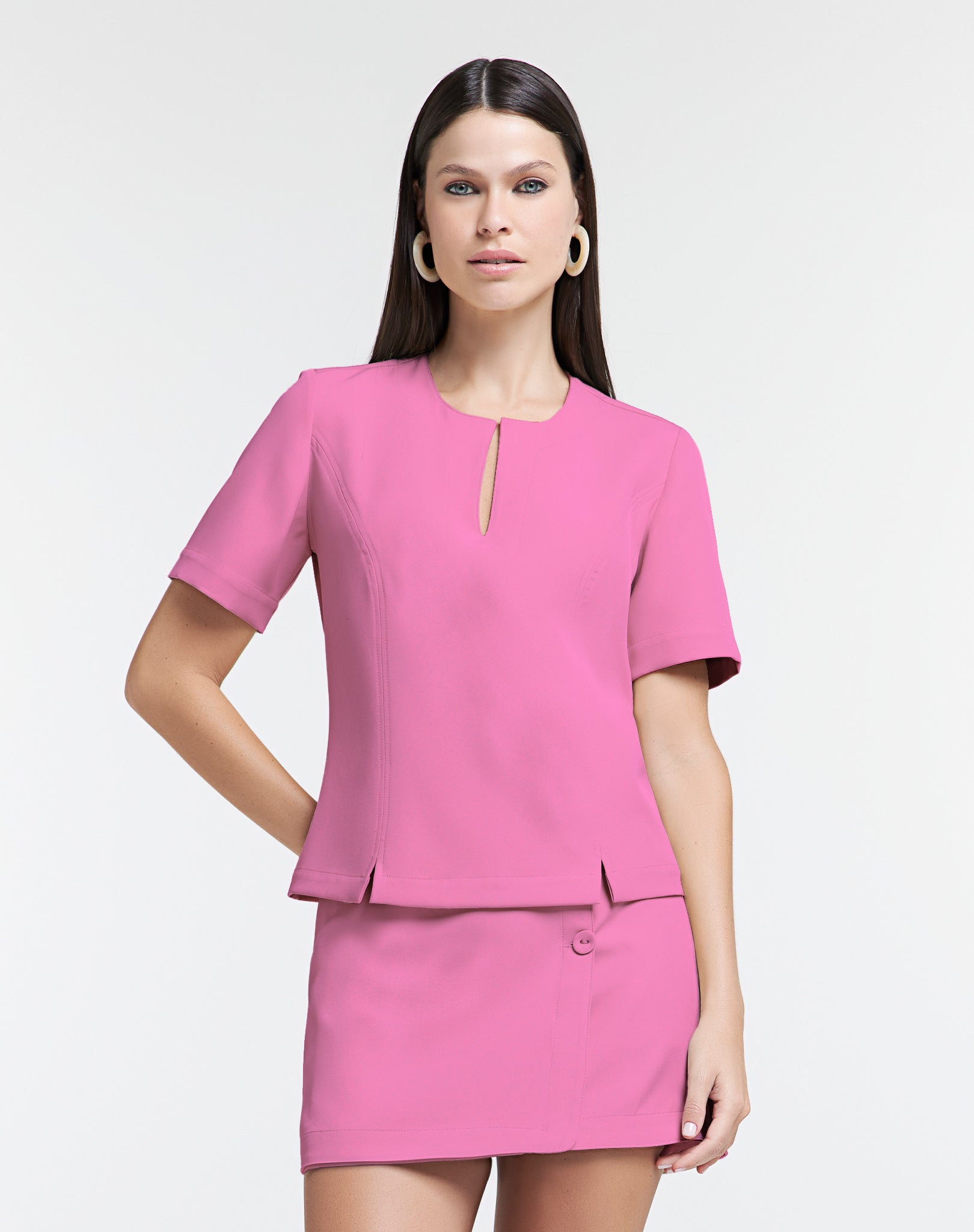 A peça que une a sofisticação da alfaiataria com o conforto do estilo athleisure. Esta blusa estruturada tem um caimento impecável e uma modelagem mais curta, ideal para ser combinada com peças de cintura alta. O decote gota adiciona um toque sutil e elegante, enquanto as mangas curtas e o tecido leve garantem o conforto para o dia a dia.
