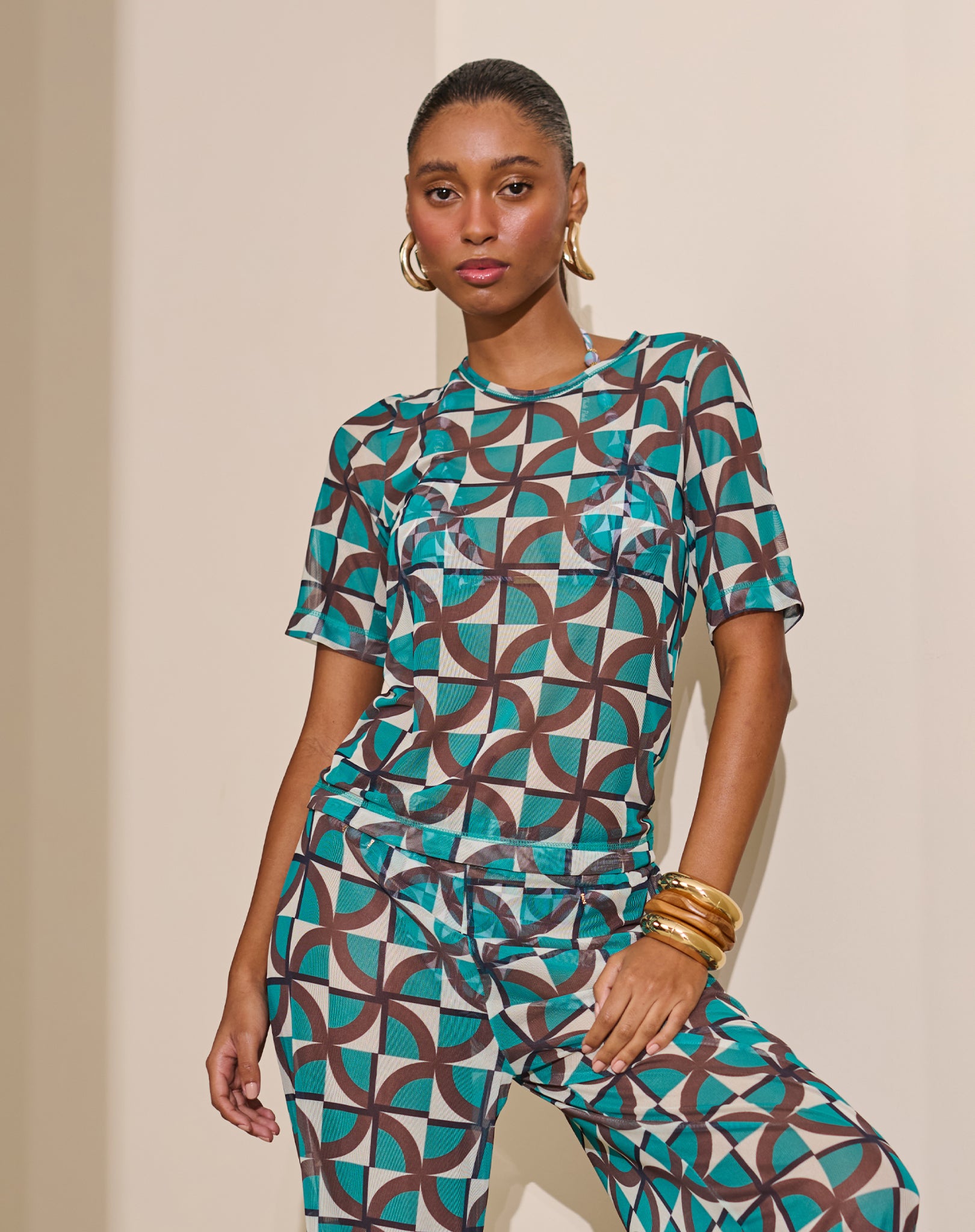 O design é clássico no corte: manga curta e gola careca. O grande destaque é a estampa geométrica com um padrão circular vibrante em tons de verde-azulado (turquesa/petróleo), marrom e bege/off-white.