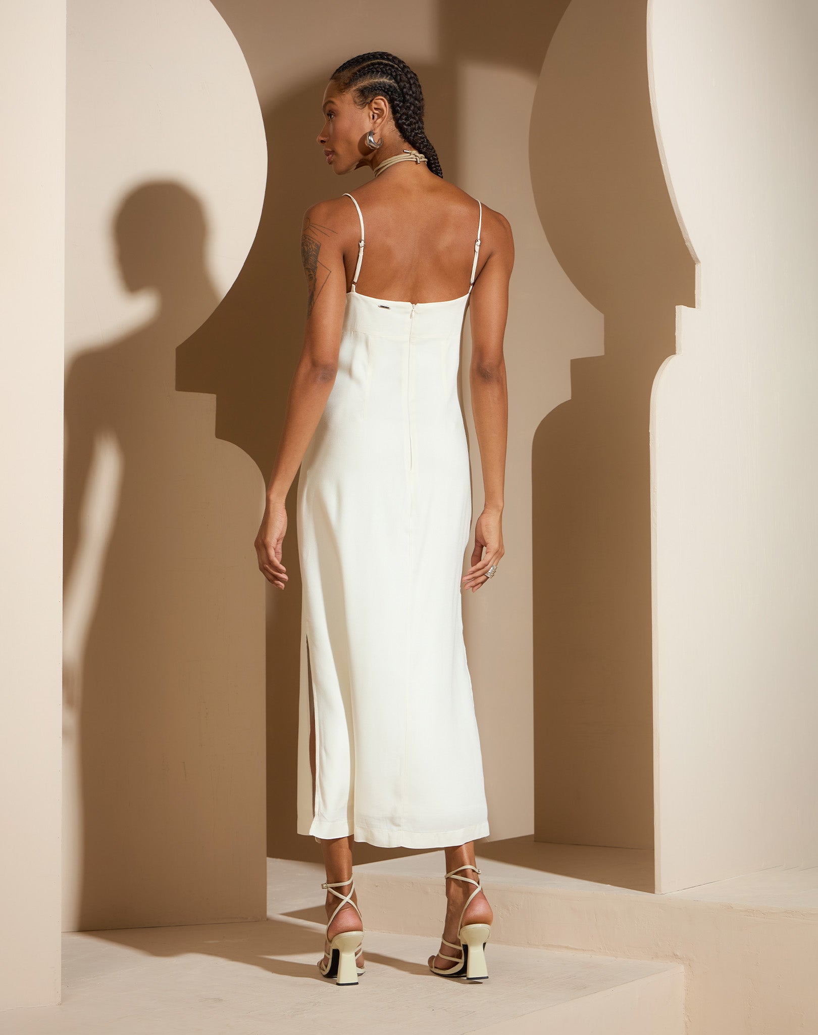 A peça ideal para elevar o seu estilo em ocasiões especiais. Este vestido midi exala elegância e sofisticação, desenhado para valorizar a silhueta com um caimento ajustado que segue o formato do corpo. As alças finas realçam o colo, ombros e as costas, proporcionando um visual ao mesmo tempo delicado e deslumbrante.