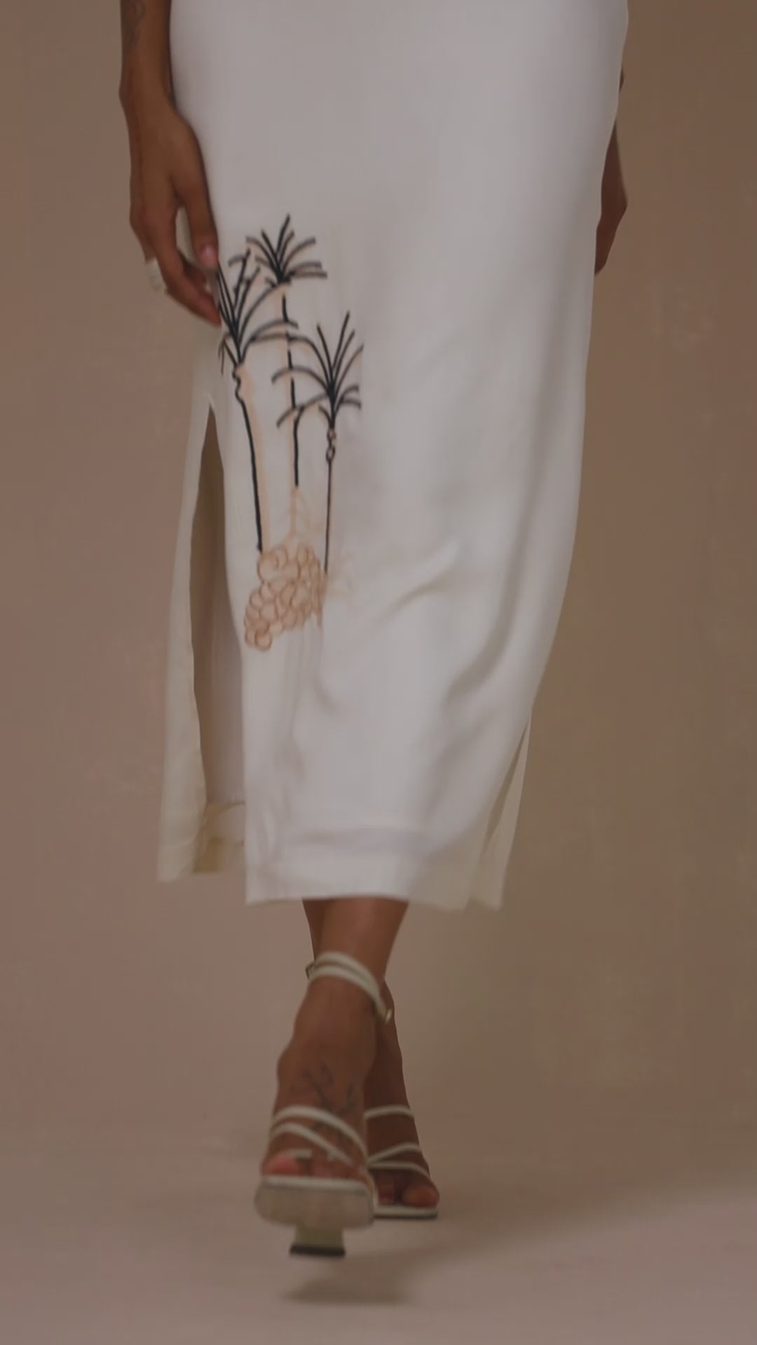 O decote coração oferece um ajuste perfeito no busto, adicionando um toque romântico e clássico. A saia, que segue em um corte reto e elegante, revela um detalhe fascinante: de um lado, uma fenda discreta e sensual, e do outro, um bordado de paisagem litorânea, que transforma a peça em uma verdadeira obra de arte.