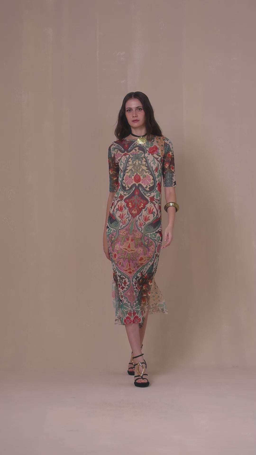 O vestido midi em tule traz a estampa Pavão, desenvolvida exclusivamente para a Primaver-Verão 26, com inspiração nas mandalas ela é composta por tipos florais em uma variação de cores vibrante e dinâmica. A transparência delicada da saia e o forro até acima dos joelhos criam um contraste sofisticado que valoriza o movimento da peça.