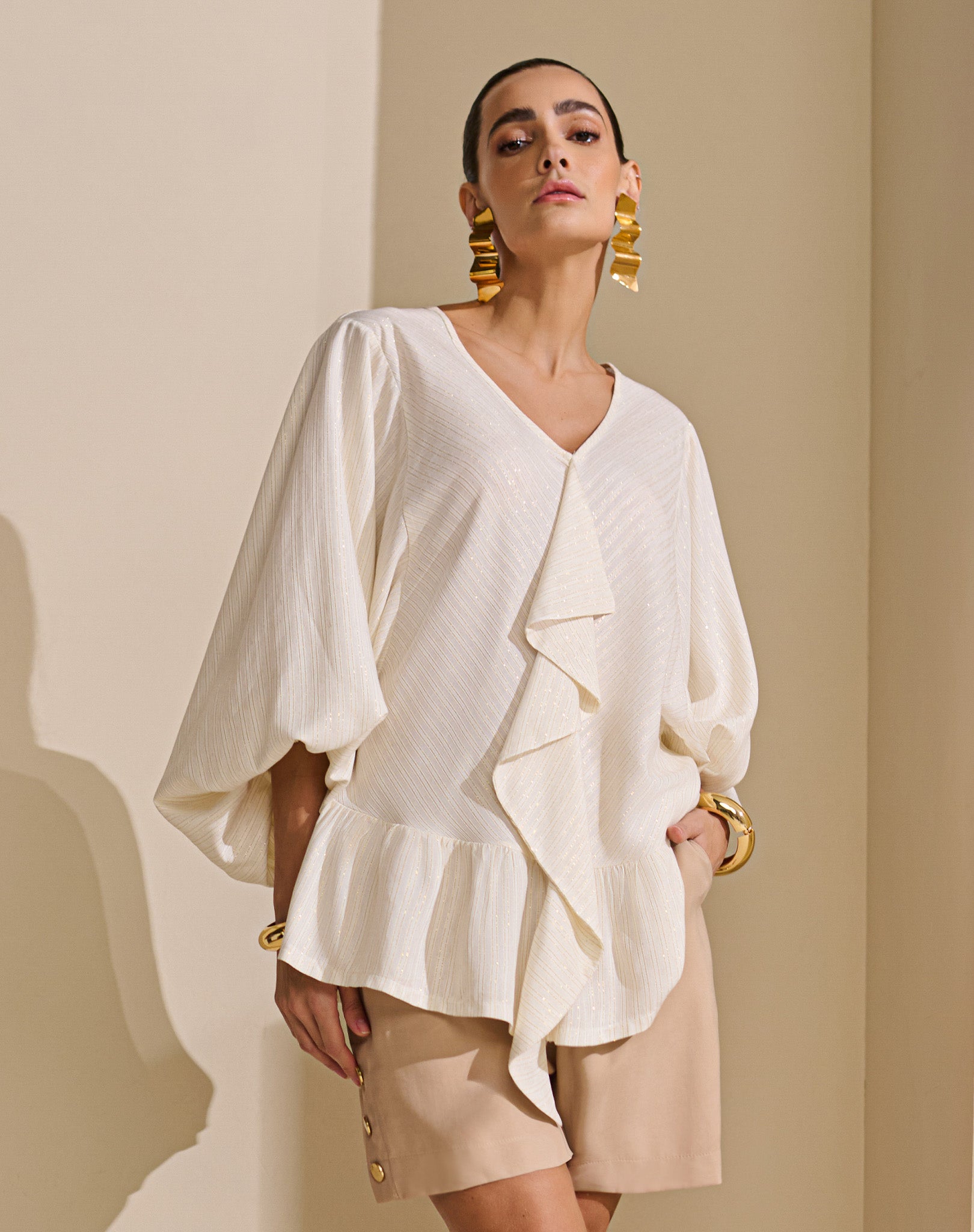 As linhas douradas discretas na diagonal sobre o tecido off-white são um belíssimo detalhe que injeta luxo e refina a peça. As mangas amplas possuem elástico no punho, permitindo que você defina a altura das mangas, criando o volume e o caimento ideal.
