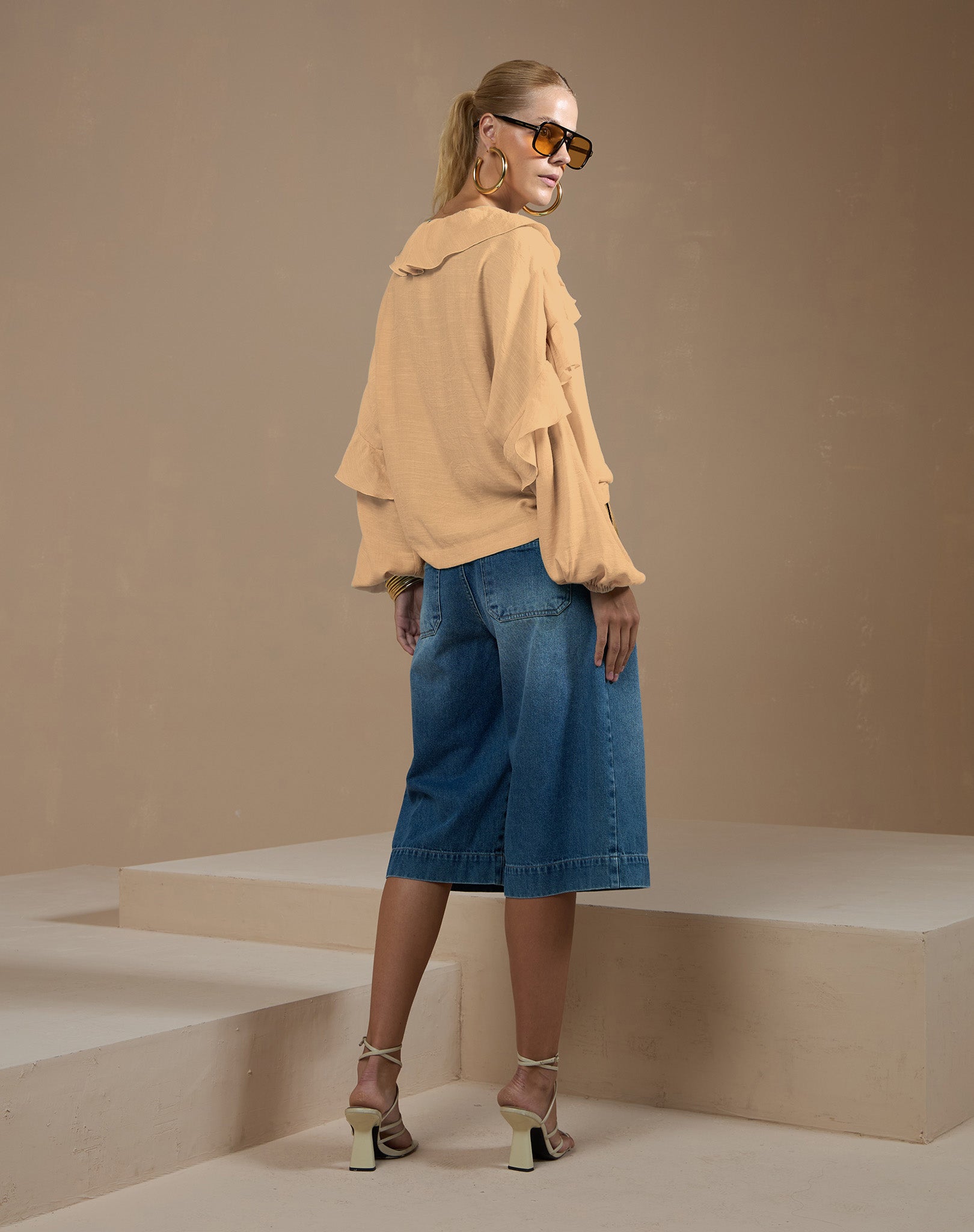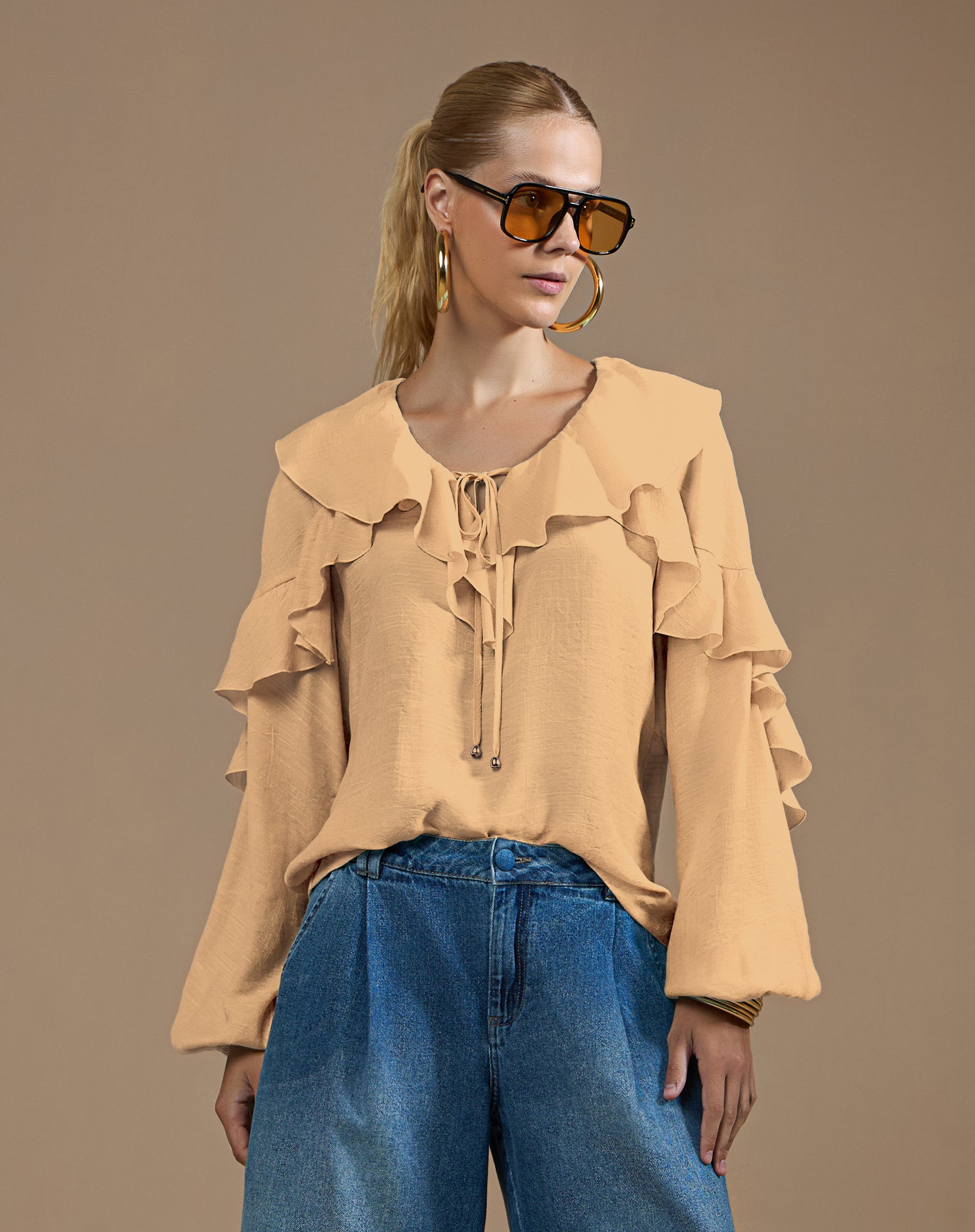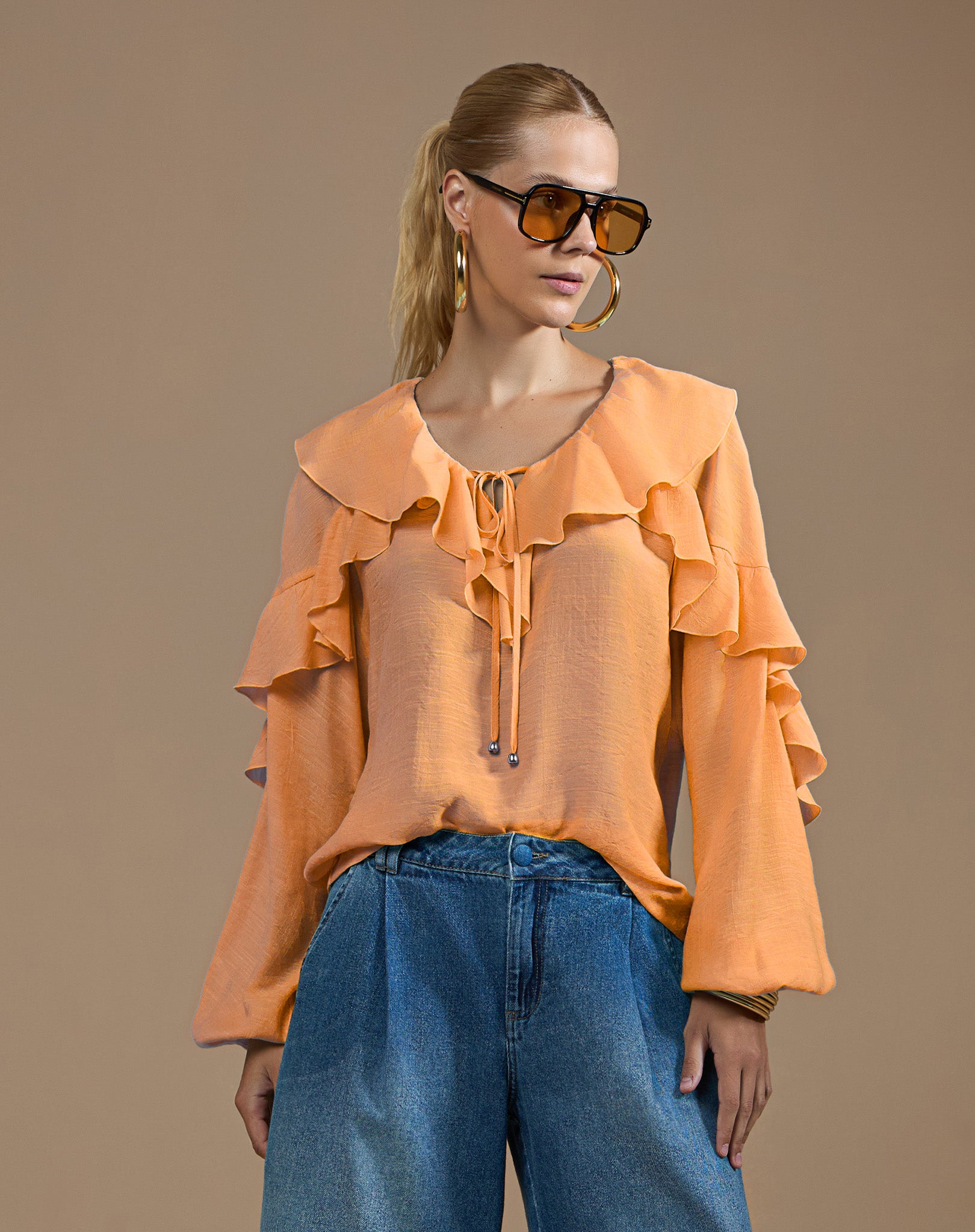 Com mood leve e toque romântico, essa bata traz detalhes que fazem a diferença: gola ampla com babado, decote redondo com cadarço para laço e mangas longas com babados e punhos ajustados, criando um volume sutil e elegante.