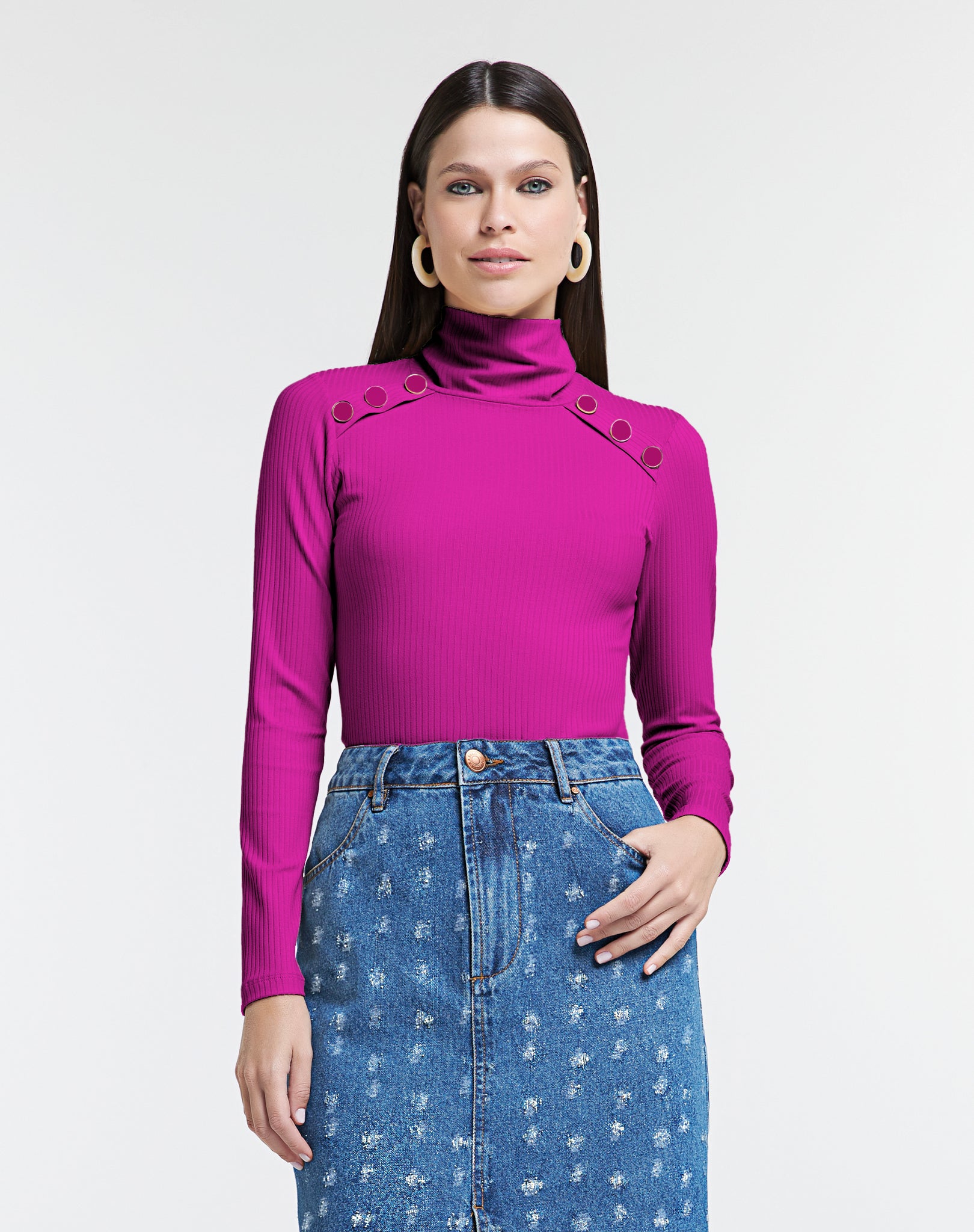 A peça essencial para criar looks elegantes e aquecidos. Esta blusa canelada possui mangas longas e uma clássica gola alta (cacharrel), que garantem conforto e estilo nos dias mais frios. Confeccionada com elastano, ela tem uma modelagem justa ao corpo, proporcionando um caimento impecável que valoriza a silhueta.