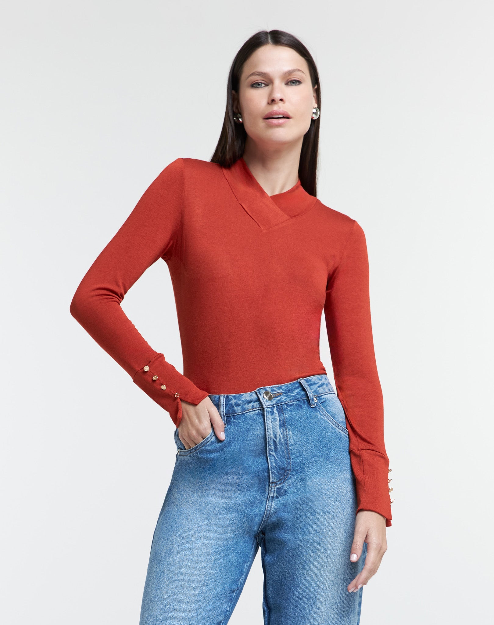 A Gola V discreta confere um toque feminino e alonga o colo, enquanto as mangas longas a tornam ideal para a transição entre as estações. Os punhos com botões dourados adicionam um detalhe sofisticado e um brilho sutil, elevando o visual de uma peça casual.