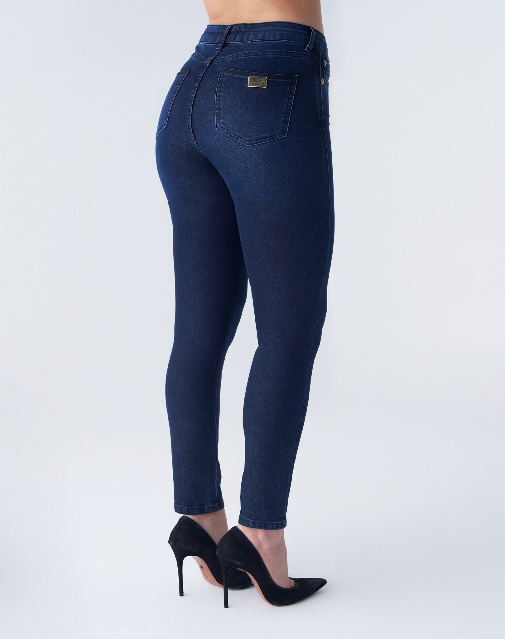 Confeccionada em jeans com elastano proporcionando um caimento bem ajustado ao corpo e muito confortável. A peça possui cintura alta, cós com passantes aplicados, bolsos frontais e posteriores, fechamento frontal por zíper e botão.