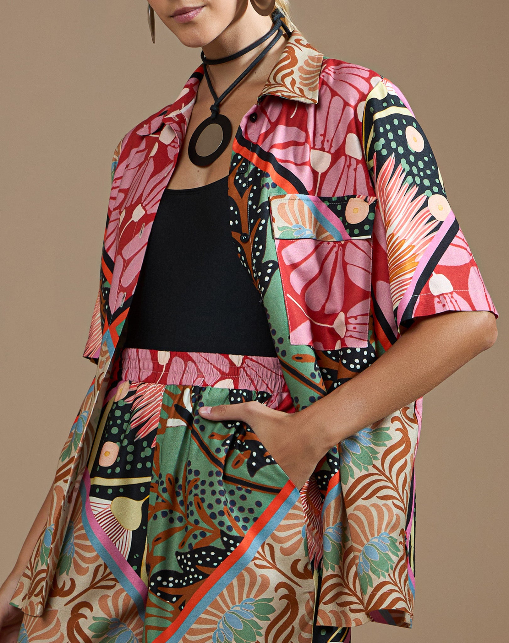 A peça que traz a arte da estampa para o seu dia a dia com conforto. Esta camisa de manga curta possui uma modelagem ampla e soltinha, garantindo um caimento fluido e agradável. O tecido leve a torna perfeita para os dias quentes.