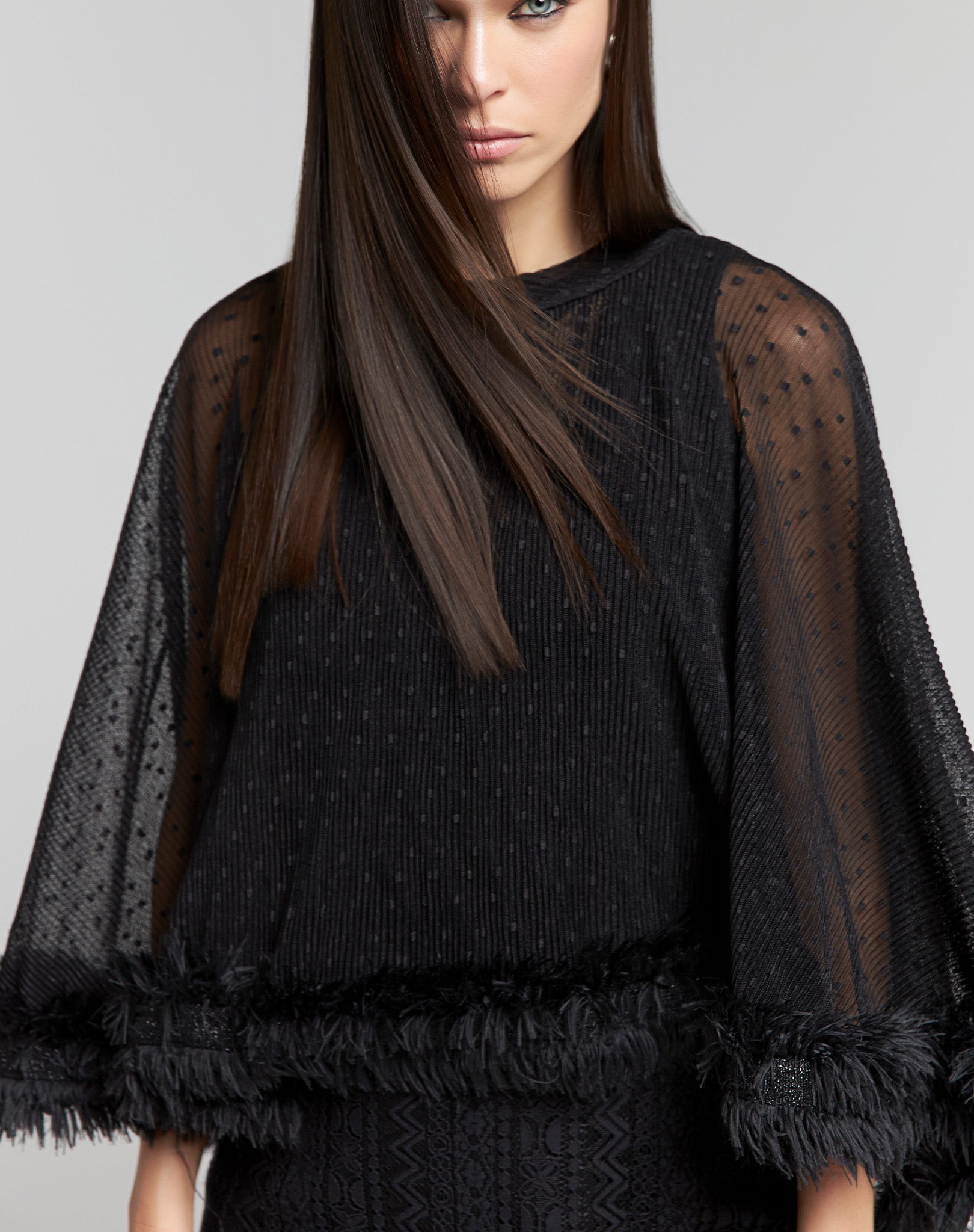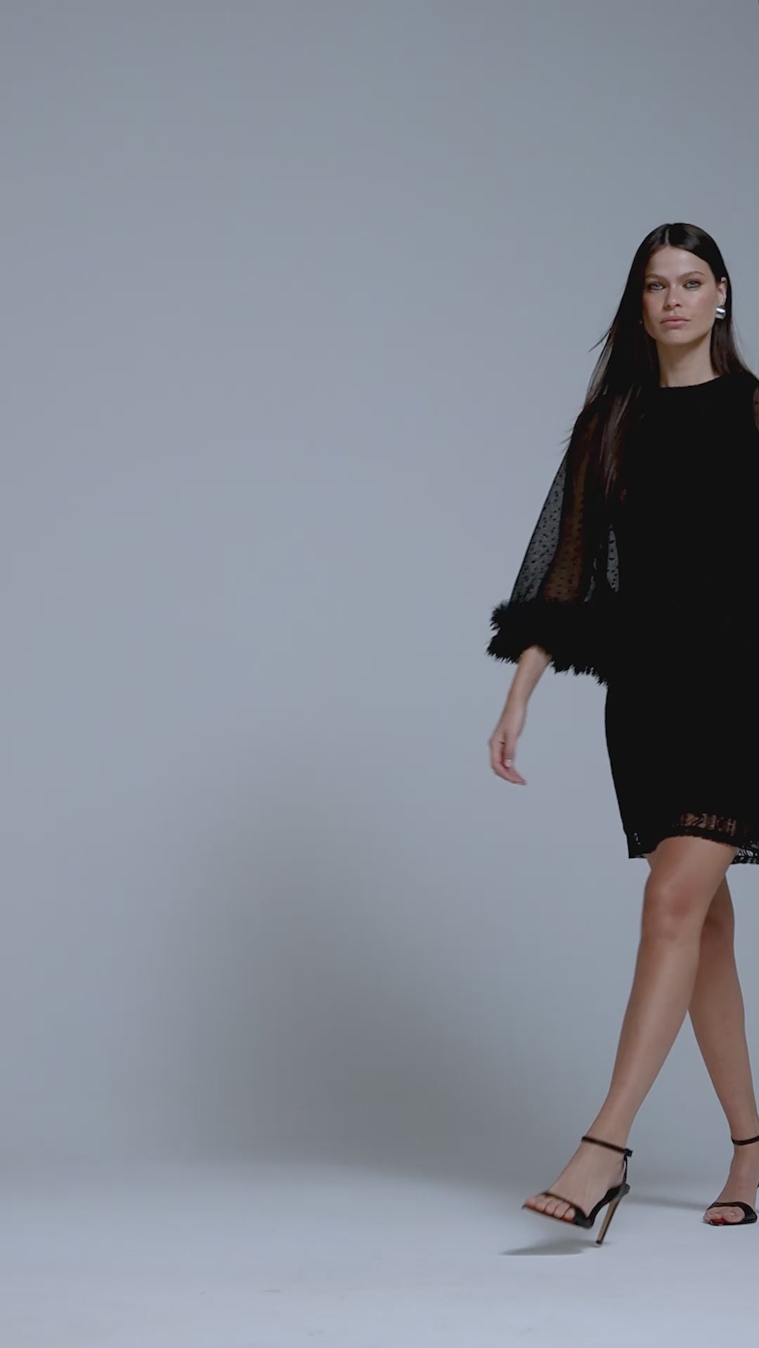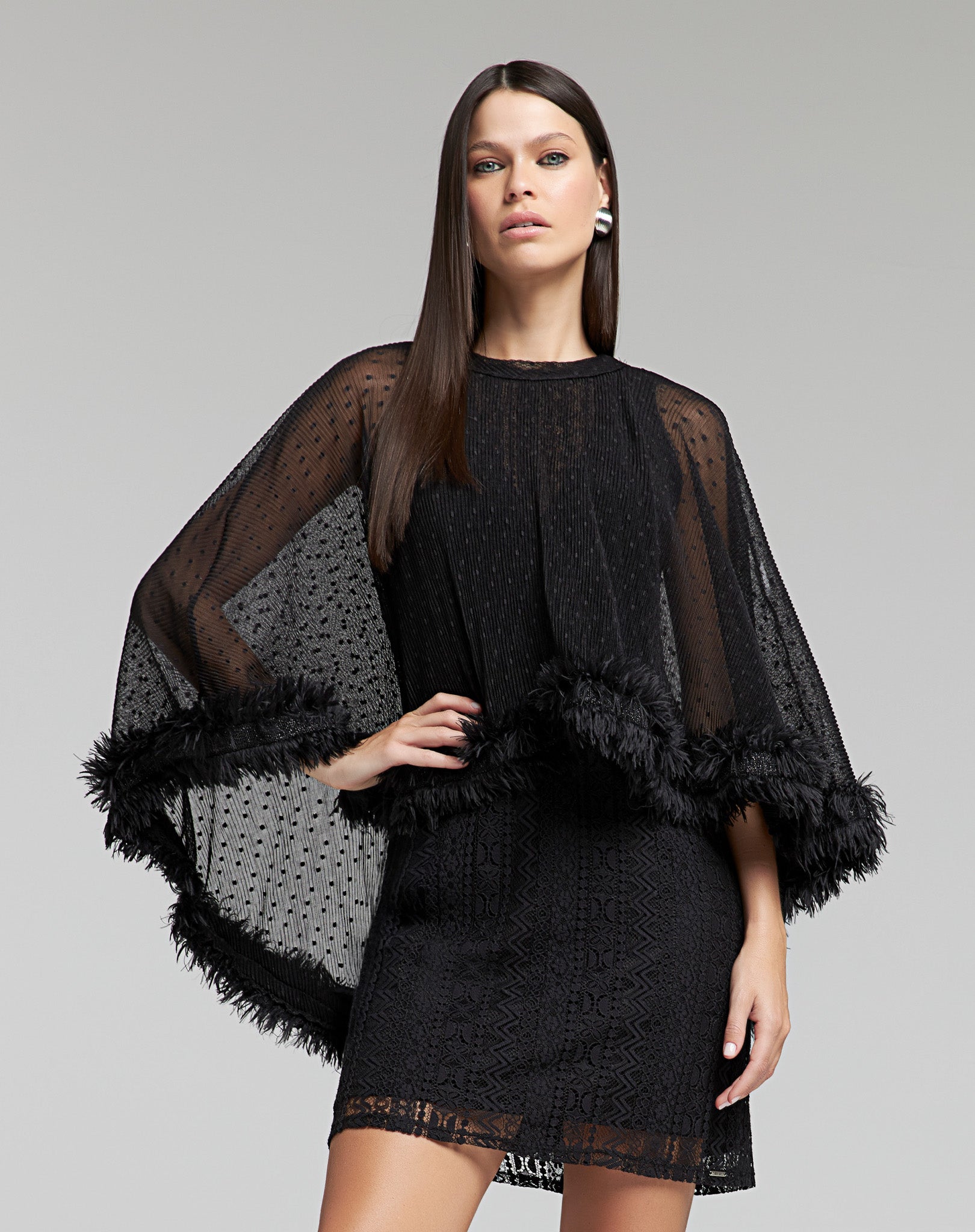 Com leveza e charme, a capa em tule preto é uma peça que transforma qualquer look. O tecido translúcido com mini poás traz um toque delicado e moderno, enquanto as plumas na barra adicionam sofisticação e movimento. Ideal para sobrepor vestidos ou conjuntos, ela cria uma silhueta leve e marcante, perfeita para jantares, eventos especiais e produções de festa. Uma sobreposição de destaque que adiciona personalidade sem pesar na composição.