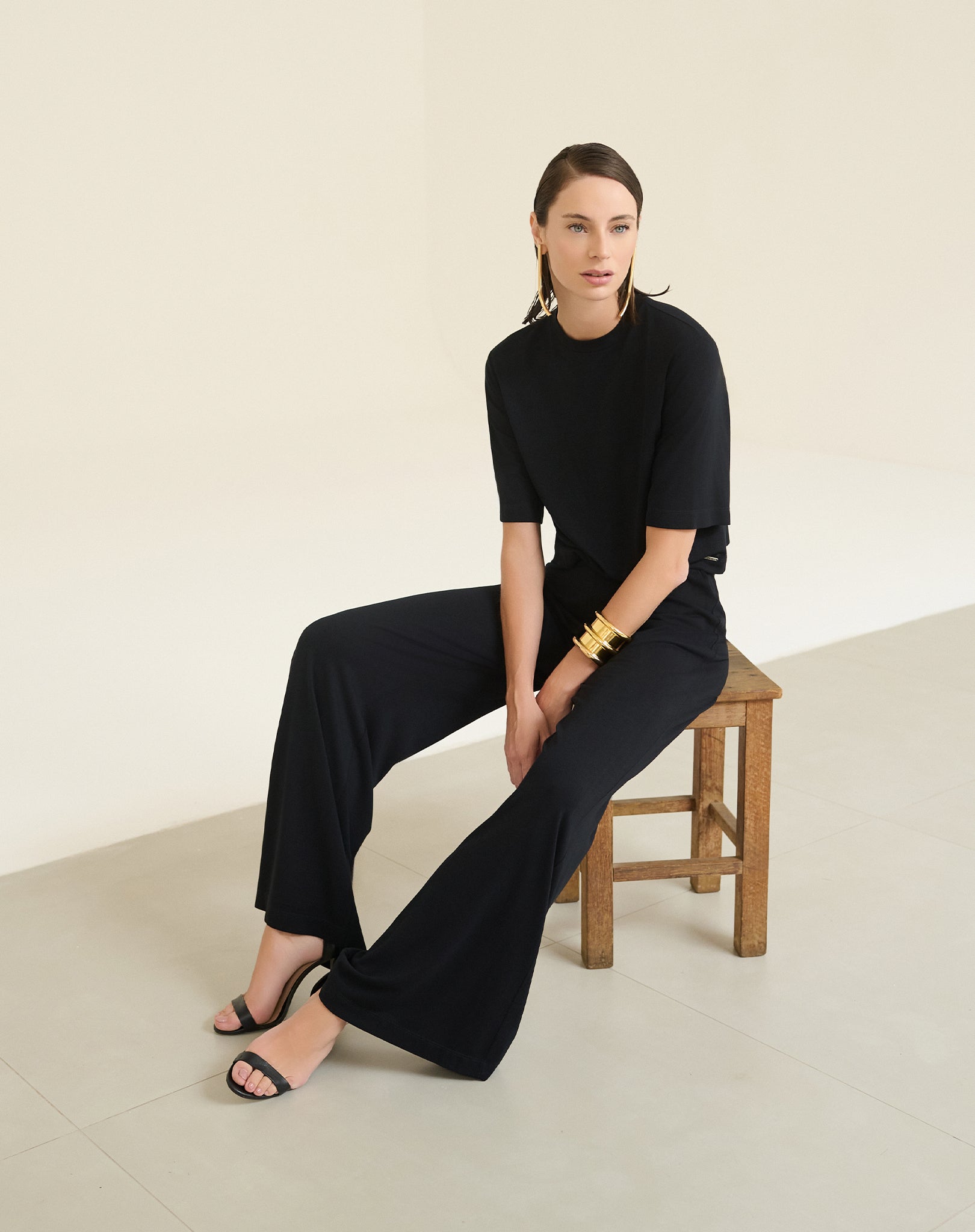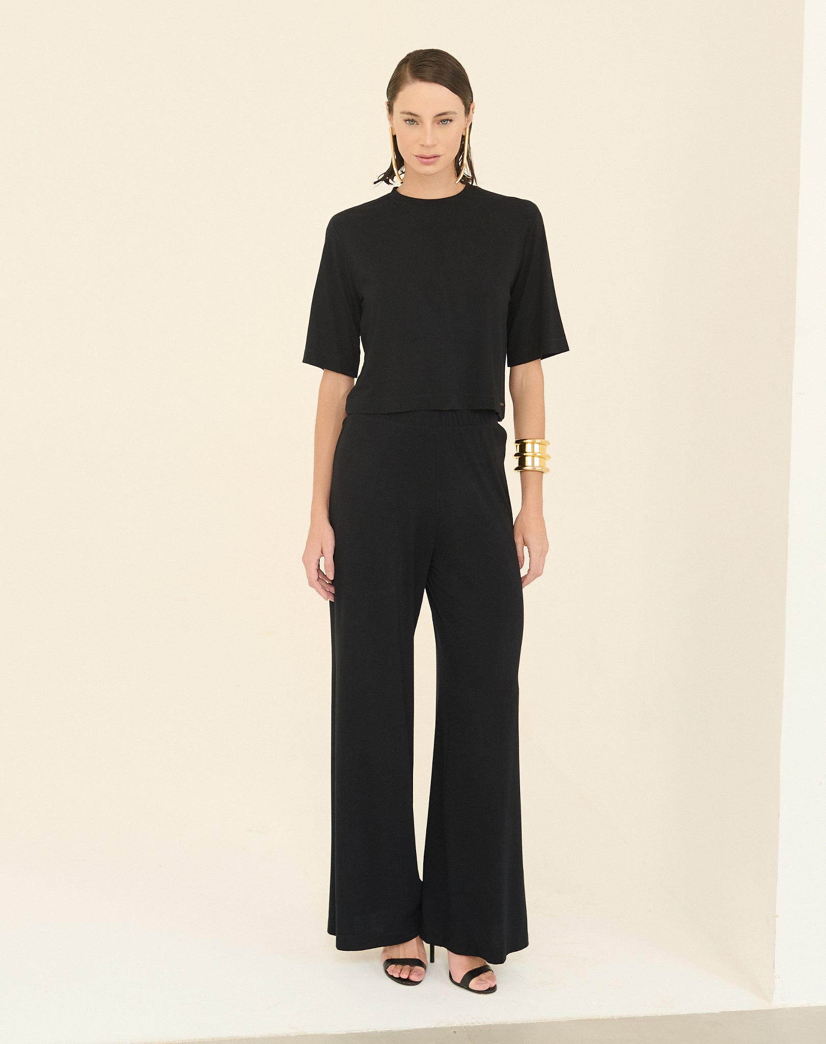 O Conjunto Essencial une conforto e sofisticação em uma produção minimalista e atemporal. A blusa de manga média, com modelagem reta e gola careca, traz um toque moderno e elegante. Já a calça pantalona, com cintura elástica, garante caimento impecável e liberdade de movimento. Feito em malha leve e fluida, é a escolha perfeita para um visual prático e refinado.