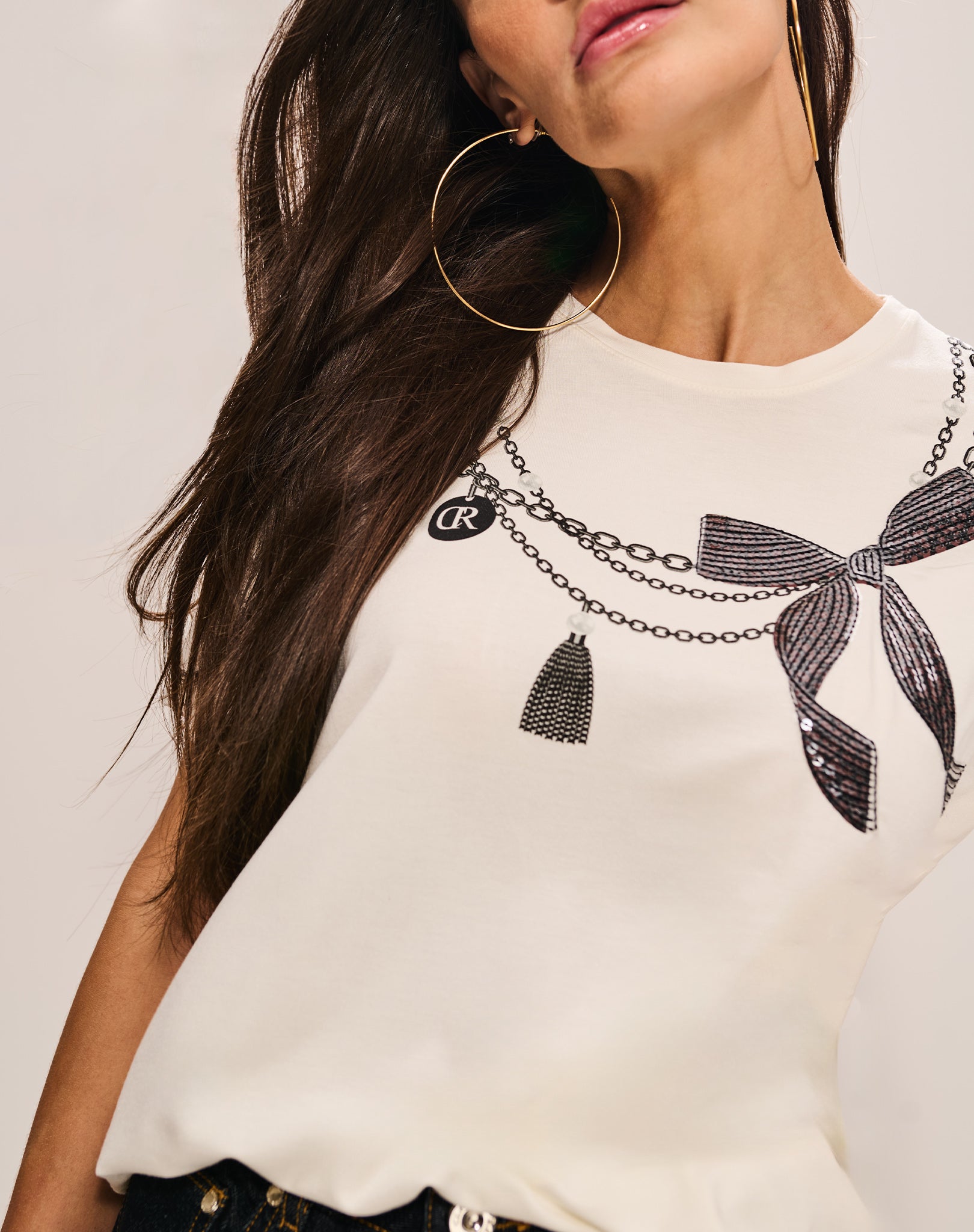 O diferencial fica por conta da estampa de laço e corrente no colo, que injeta modernidade e um charme sutil.