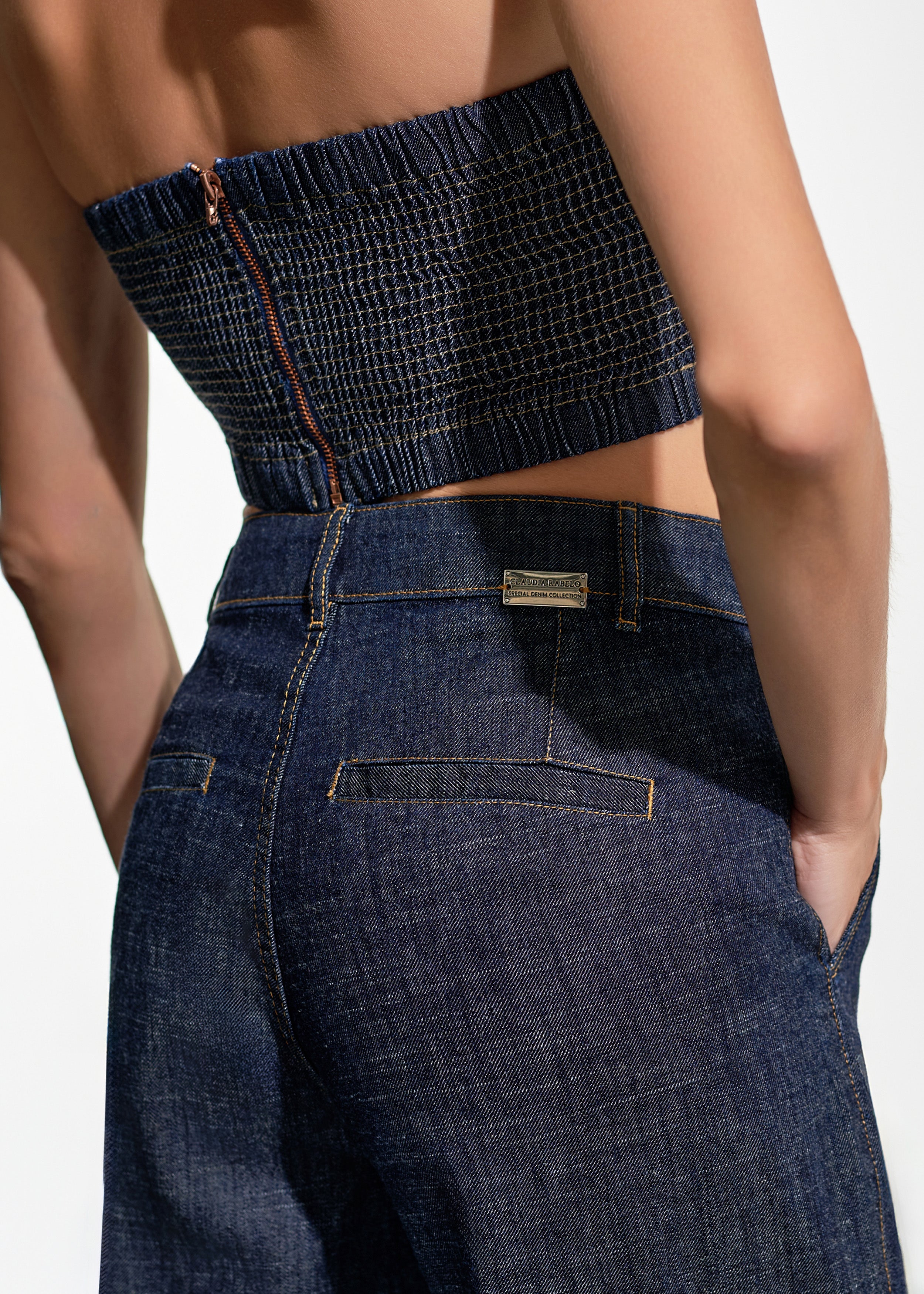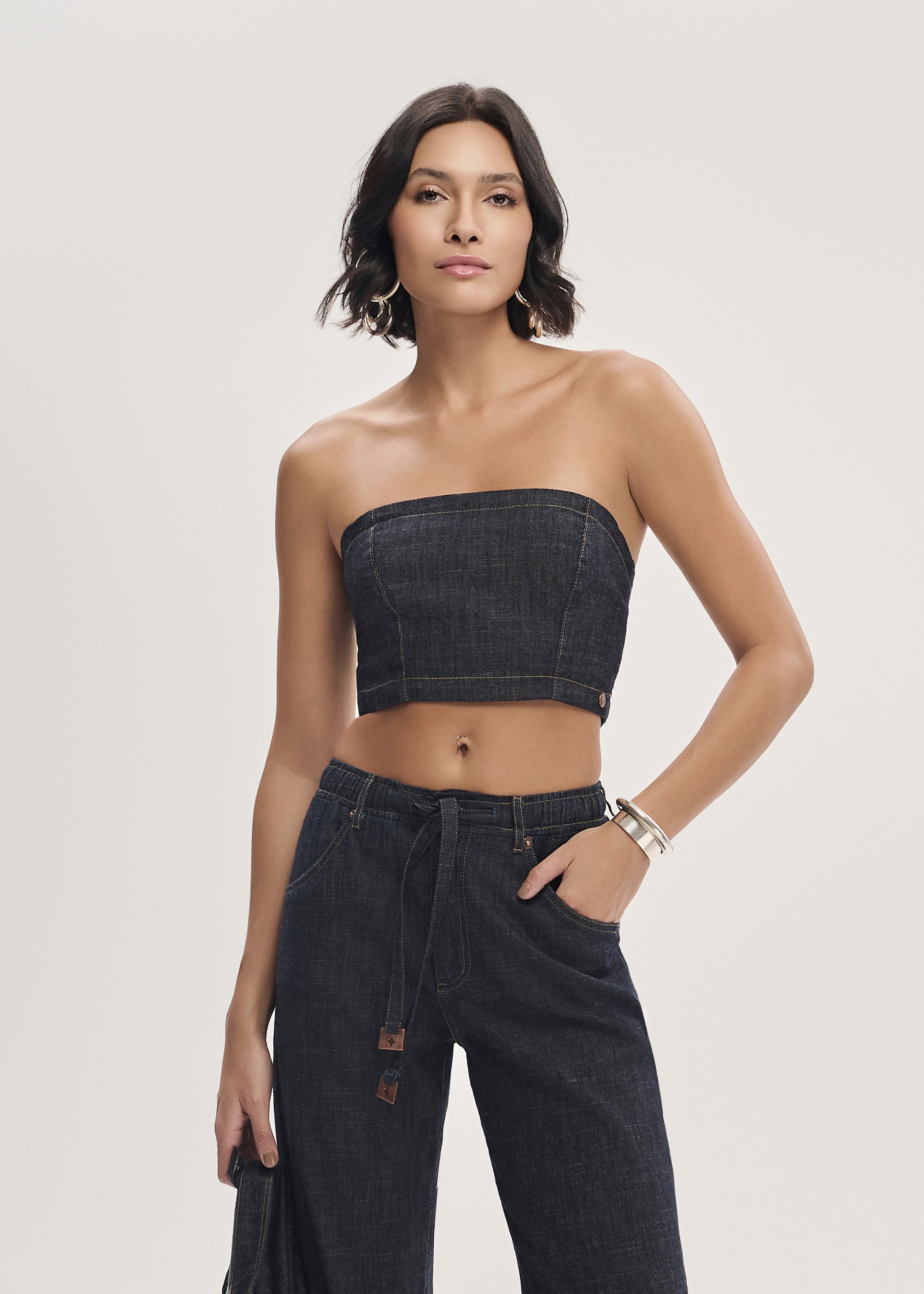 O top jeans sem alças surge em versão atualizada com lavanderia escura e pesponto contrastante, trazendo aquele contraste cool que eleva qualquer produção. Feito para vestir com conforto e estilo, tem zíper nas costas e elástico embutido que garante ajuste ao corpo.